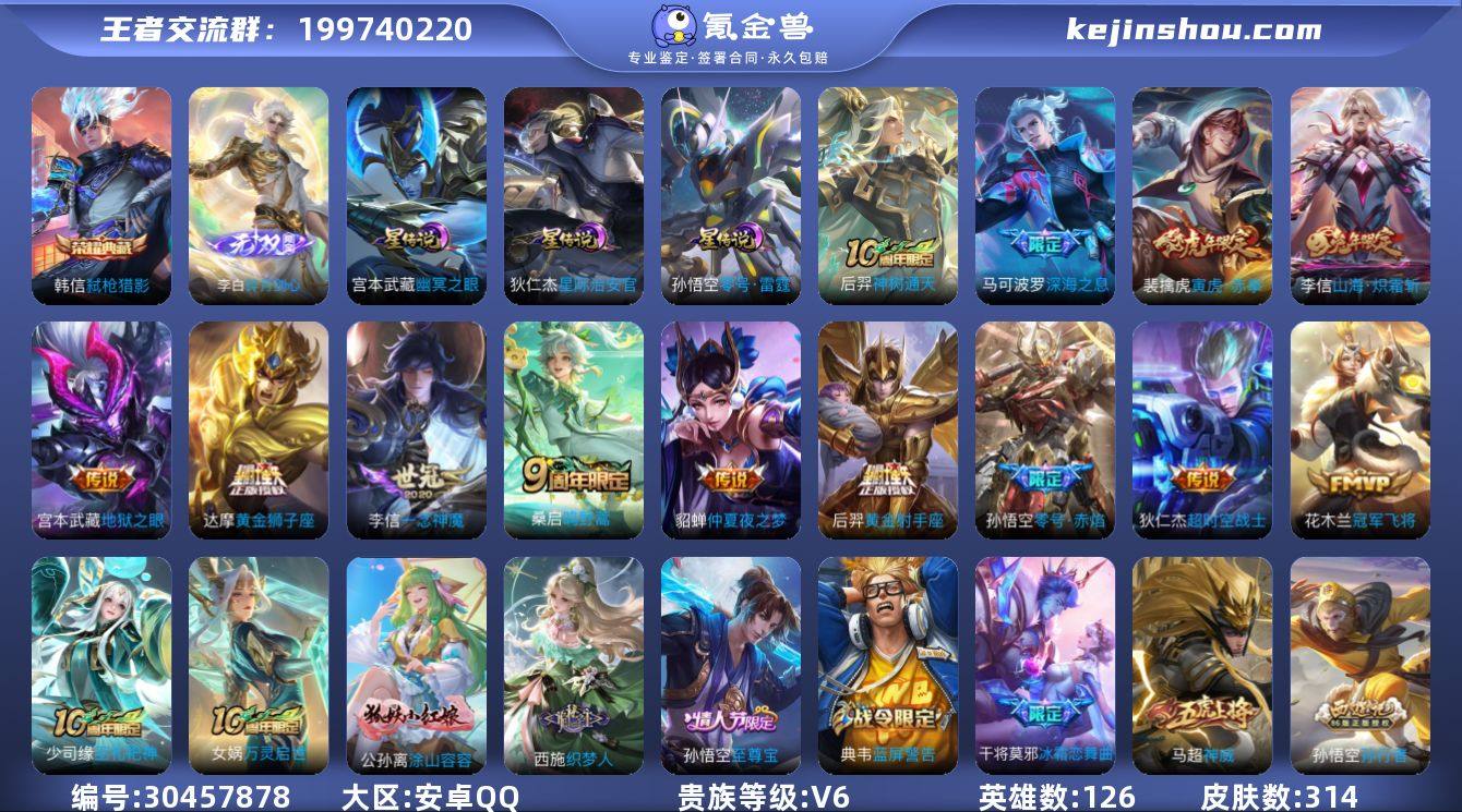 贵族等级:V6 典藏皮肤数:1 珍品无双皮肤数:0 无双皮肤数:1 珍品传说皮肤数:0 传说皮肤数:13 史诗皮肤数:95 皮肤数:314 英雄数:126 段位:无双王者 卖家说:和平连体号,七级风花雪月,三飞行器