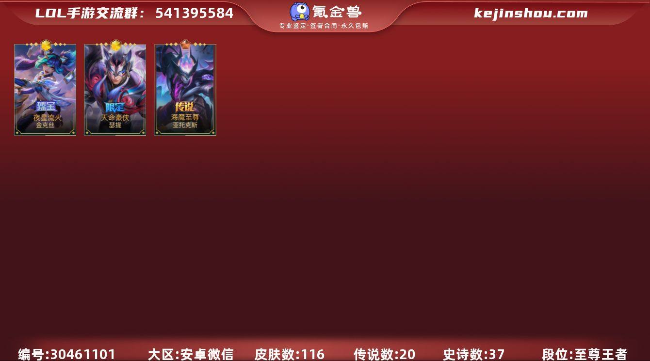 皮肤数:116 典藏皮肤数量:0 神话皮肤数量:2 传说皮肤数量:20 史诗皮肤数量:37 夜星流火 金克丝,天命豪侠 瑟提 段位:至尊王者 卖家说:现赛季至尊王者,两个小国服,可二次实名,神话皮肤2,传说皮肤20,史诗皮肤37,剩下的精魄够你买你喜欢的英雄。