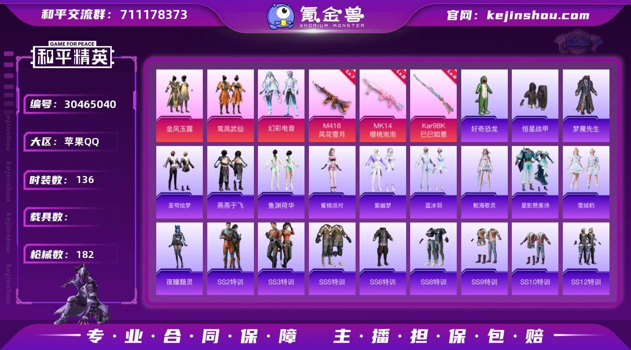 苹果【小号/M416-风花雪月(七级)】 手Q-3粉装-3特效枪-0载具-1粉色飞行器-54539热力值-4王牌印记-136套装-182枪皮 【粉色套装】:粉装-金风玉露,粉装-鸾凤武仙,粉装-幻彩电音 【粉色枪皮等级】:M416-风花雪月(七级),Kar98K-巳巳如意(四级),Mk14-樱桃泡泡(六级) 【粉色枪皮】:M416-风花雪月,Kar98K-巳巳如意,Mk14-樱桃泡泡 【粉色飞行器】:冠军兔兔飞行器 【粉色降落伞】:快乐主宰降落伞,四圣焕新降落伞,心之恋语降落伞,暗夜玫瑰降落伞,齐天大圣降落伞,太空嘟嘟降落伞,彩虹独角兽降落伞,月下星之子降落伞,星穹咏叹调降落伞 【稀有套装】:套装-圣穹绘梦,套装-燕燕于飞,套装-鱼渊荷华,角色-蜜桃派对,套装-紫幽梦,套装-蓝冰羽,角色-鲛海歌灵,套装-星影赞美诗,套装-雪绒豹,角色-夜瞳黯灵 【稀有枪皮】:AKM-夜灯,AKM-奇异狩猎者,AKM-彩虹符号,AKM-灼热熔岩,AKM-生命誓言,AKM-破晓战魂,AKM-萌趣颜团子,AKM-虎虎生威,AKM-霓虹街区,M16A4-凝视深渊,M16A4-幻世战舞者,M16A4-红色方程式,M16A4-蓝色火焰,SCAR-L-炫彩节奏,SCAR-L-玉兔迎春,SCAR-L-红色方程式,SCAR-L-雷霆特警,SCAR-L-黄金龙骨,M416-红色方程式,M416-蓝色火焰,GROZA-生命誓言,GROZA-蓝莓炮弹,GROZA-雷霆特警,GROZA-黑色刀锋,AUG-耀粉歌者,AUG-青春冒险家,QBZ-原初圣火,QBZ-彩虹符号,QBZ-未来歌姬,QBZ-诡娃娃,QBZ-飞驰魅影,M762-天降萌叽,M762-深海曼妙,M762-牛气冲天,M762-瑞龙福将,M762-诡娃娃,M762-镭射皇者,M762-云朵鹅,G36C-暗夜玫瑰,G36C-星穹咏叹调,AC-VAL-天降萌叽,蜜獾-垂柳戏鸭,蜜獾-天降萌叽,蜜獾-娇憨猪猪,UZI-天降萌叽,UZI-娇憨猪猪,UZI-幻影战神,UZI-炫彩节奏,UZI-生命誓言,UMP45-时空追击者,UMP45-蓝色火焰,UMP45-圣穹绘梦,Vector-彩虹符号,Vector-生命誓言,...