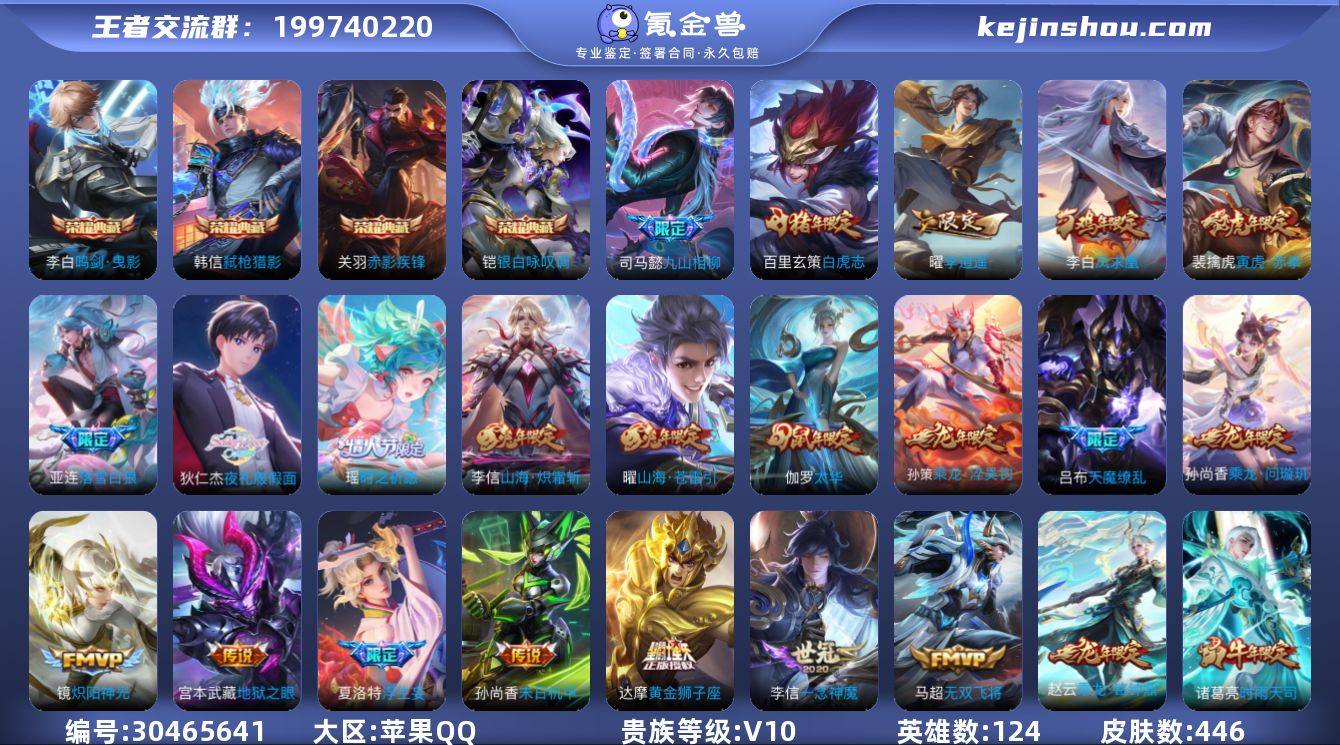 【1629】苹果Q-V10-最强王者段位-124英雄-446皮肤-4典藏皮肤-54传说-146史诗 【英雄全皮】:司马懿全皮,钟馗全皮,李信全皮,夏洛特全皮,戈娅全皮 【荣耀典藏】:李白鸣剑曳影,关羽赤影疾锋,铠银白咏叹调,韩信弑枪猎影 【传说皮肤】:司马懿九山相柳,亚连落雪白狼,吕布曦玄引,孙尚香乘龙问璇玑,孙策乘龙淬吴钩,赵云乘龙铭钟鼎,艾琳觅芳踪,狄仁杰夜礼服假面,王昭君永恒水手月亮,夏洛特浮生妄,花木兰燃星之曲,项羽无限倾心,孙悟空齐天大圣,曜山海苍雷引,李信山海炽霜斩,吕布怒海麟威,李白诗剑行,不知火舞绯月行,百里守约碎云,后羿无尽星芒,马超无双飞将,孙策挚爱之约,女娲补天,孙策末日机甲,瑶时之祈愿,裴擒虎寅虎赤拳,孙尚香异界灵契,赵云淬星耀世,王昭君乞巧织情,曜李逍遥 ,兰陵王默契交锋,诸葛亮时雨天司,铠绛天战甲,镜炽阳神光,虞姬启明星使,关羽武圣,曜云鹰飞将,李信一念神魔,刘备时之恋人,伽罗太华,貂蝉猫影幻舞,干将莫邪久胜战神,达摩黄金狮子座,百里玄策白虎志,花木兰冠军飞将,梦奇胖达荣荣,诸葛亮武陵仙君,貂蝉仲夏夜之梦,李白凤求凰,孙尚香末日机甲,宫本武藏地狱之眼,孙悟空地狱火,吕布天魔缭乱,狄仁杰超时空战士 【限定皮肤】:白起狰,姜子牙天穹之誓,狄仁杰阴阳师,廉颇寅虎御盾,赵云皇家上将,赵云引擎之心,赵云百木心枪,墨子降魔,嬴政优雅恋人,嬴政白昼王子,孙尚香异界灵契,鲁班七号狮舞东方,鲁班七号乒乒小将,庄周高山流水,阿轲迷踪丽影,钟无艳超时空战士,扁鹊奇幻香踪,白起夜都怪侠,芈月白晶晶,芈月幻夜卜梦,吕布天魔缭乱,吕布猎兽之王,吕布御风骁将,周瑜赤莲之焰,元歌云间偶戏,元歌无心,夏侯惇朔风刀,甄姬游园惊梦,甄姬落雪兰心,典韦穷奇,典韦蓝屏警告,马可波罗逐梦之星,马可波罗暗影游猎,马可波罗山海...