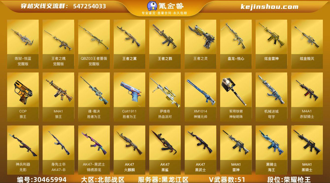 段位:荣耀枪王 VIP等级:VIP6 V武器数:51 王者武器数:9 炫金武器数:3 炼狱-悦蓝-觉醒版,王者之魄-觉醒版,QBZ-03-王者蔷薇-觉醒版,王者之翼,王者之戮,王者之灵,盘龙-悦心 炫金雷神,炫金毁灭 Colt1911-胜者为王,COP-狼王,魂·裁决-胜者为王,军用铁锹-神秘明珠,M4A1-狼王,萨维奇-热血派对,XM1014-神猪元帅,机械迷城-穹宇,M4A1-赤狱骑士,无影-神兵利器,AK47-B-身先士卒,AK47-黑武士-锦绣游龙,AK47-火麒麟,AK47-黑鲨,AK47-黑武士,M4A1-雷神,黑骑士-海王,M4A1-黑骑士,M4A1-黑龙,M4A1-龙血,M4A1-千变,M4A1-玫瑰精灵,M200-幻神,Barrett-毁灭,Barrett-极光,AWM-天龙,Kar98k-星神,AA-12-雷霆,9A91-烈火,屠龙,龙啸,麒麟刺,擎天,AK47-B-常胜将军,Barrett-暗月传说,斩神刀-雷暴,AK47-B-战士,AK47-B-战神,AK-47-猩红传说,裁决,天神 王者-葵-貂蝉 葵,零·纪元,迷迭香,雅典娜,职业选手 M200-幻神音效卡,M4A1-黑骑士音效卡,Barrett-毁灭音效卡,M4A1-雷神音效卡,AK47-火麒麟音效卡 卖家说:可小刀