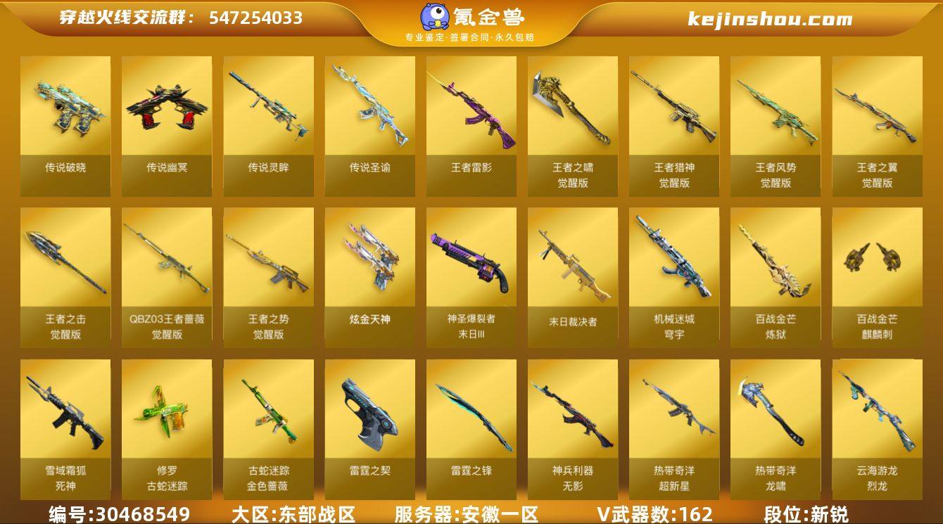 实名: 可修改 排位资格: 有 V武器: AK47-火麒麟,AK47-雷暴,M4A1-雷神,M4A1-黑骑士,M4A1-死神,M4A1-黑龙,M4A1-青龙,Barrett-毁灭,Barrett-极光,Barrett-朱雀,Kar98k-星神,AA-12-雷霆,QBZ03-金色蔷薇,RPK-盘龙,加特林-炼狱,沙鹰-天神,屠龙,龙啸,麒麟刺,M4A1-幻灵,柯尔特-竞技荣光,USP-雷暴,擎天-竞技荣光,斩神刀-雷暴,幻灵之锋,AK-47-猩红传说,盘龙,柯尔特-冠军之特,M14EBR-玄武,炽芒蝶刃,传说灵眸,G36C-幻影,传说幽冥,传说破晓,VSK-94-金蚀,龙啸-烈火龙威,屠龙-动感闪耀,屠龙-云海游龙,擎天-云海游龙,AK47-黑武士-锦绣游龙,云龙扇,COP357-云龙,八面凌龙,烈龙-云海游龙,龙啸-热带奇洋,超新星-热带奇洋,无影-神兵利器,雷霆之锋,雷霆之契,金色蔷薇-古蛇迷踪,修罗-古蛇迷踪,传说圣谕,死神-雪域霜狐,麒麟刺-百战金芒,炼狱-百战金芒,机械迷城-穹宇,神圣爆裂者-末日III,末日裁决者,AWM-灵狐-15周年嘉年华 王者武器: 王者之势-觉醒版,QBZ-03-王者蔷薇-觉醒版,王者之击-觉醒版,王者之翼-觉醒版,王者风势-觉醒版,王者猎神-觉醒版,王者之啸-觉醒版,王者雷影 炫金武器: 炫金天神 热门武器: 斯泰尔-蝴蝶,MAC 10-龙宝,MK5-炽火炎龙,斯泰尔-枪娘暗刃,黄金猫猫手套-白鲨 狙击枪稀有皮肤: 幻神-冠军之幻,幻神-宠儿,星神璀璨,毁灭-墨兰 皮肤,M200-幻神-N9-2022MVP,幻神-动感闪耀 皮肤,幻神-Heartshot,毁灭-枪娘巴雷特 英雄角色: 王者-葵-貂蝉,影豹,电竞教官-云悠悠,王者-沙漠玫瑰,传说艾莉莎,荒漠琉璃,晴雅,雾萌萌,月兔特工,隼,岚兮儿,传说影煞,雨墨,王者雨墨 音效道具: M4A1-雷神音效卡,Barrett-毁灭音效卡,M200-幻神音效卡,死神-雪域霜狐-怀旧音效卡