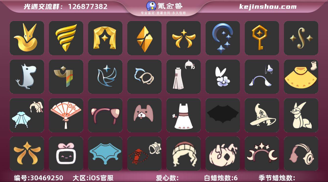 安卓官服 手机账号 4珍稀物品 11毕业季 6毕业图 121蜡烛 【珍稀物品】白枭(帝企鹅发),阿努比斯(狗头),透明蝶翼斗,鳐鲲斗篷 【季节已毕业】圣岛季,预言季,梦想季,集结季,风行季,表演季,破晓季,欧若拉季(欧若拉),追忆季,夜行季,拾光季 【完成地图】晨岛,云野,雨林,霞谷,墓土(暮土),禁阁 【礼包】新年裤(瑞气服饰),暗彩装扮(彩虹武士裤),南瓜(冥龙南瓜),巫师(巫师帽),绊爱(绊爱斗篷)(绊爱礼包),橘子(大橘大利),兔子(玉兔头饰)(玉兔发饰)(兔子发饰),四叶草(四叶草头饰),星月头饰(星月头冠),枯角(巫树犄角),鹿角(圣诞鹿角),创始人(创始人斗篷),围巾(小王子斗篷)(小王子围巾),欧若拉之翼,蝙蝠套(蝙蝠斗篷)(南瓜头),猫套(皮皮猫斗)(皮皮猫礼包),瑞雪(瑞雪斗篷)(暖冬瑞雪),红伞(瑞气纸伞),魔法棒(惊喜手杖)(仙女棒),灯笼(中秋灯笼),秋千(情人秋千),跷跷板(情人跷跷板),茶桌(花憩茶桌),茶壶(小憩茶桌),猫背饰(猫咪背饰),滑板(冲浪滑板)(冲浪板),大铁头 【裤子】蓝绿裤(高领舞服),武士裤,背带裤,搓澡巾,击剑裤 【面具】黄眉企鹅面具,夜行毕业面具(棕熊面具),贴花面具(丛林黑面具),阿努比斯,凤凰面具 【面饰】黑框眼镜(粗框眼镜),红耳机 【项链】围巾(肩带) 【发型】留辫蘑菇头,虚荣,若笠(箬笠) 【头饰】平顶帽,蓝色音乐会(蓝色音乐符),行军锅头盔(六边锅帽子)(双耳锅帽子),牛仔帽(西部帽),羽毛发饰(多羽发饰) 【斗篷】冥龙斗篷,燕尾斗篷,黄色连帽披风(连帽斗篷)(斜边队长斗篷),遥鲲斗篷(双翼遥鲲斗),粉红绒毛斗篷(绒毛斗篷),蟑螂斗(凤凰斗篷),绿芽,海洋斗 【配饰】鲲灯(追忆之书),蓝色手碟(毕业手碟),圆鼓(手拍大鼓),相机(季卡相机),雨伞,高音钢琴(白色高脚钢琴)