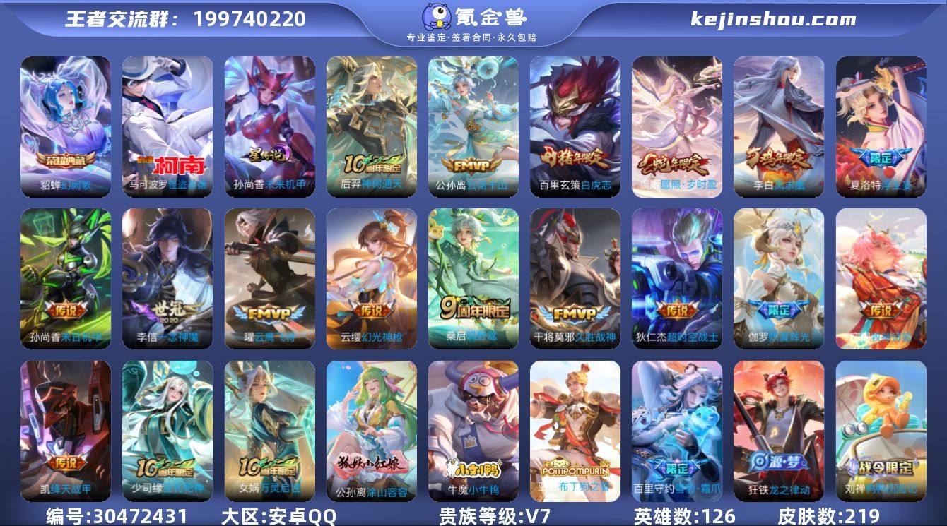 贵族等级:V7 典藏皮肤数:1 珍品无双皮肤数:0 无双皮肤数:0 珍品传说皮肤数:1 传说皮肤数:16 史诗皮肤数:57 皮肤数:219 英雄数:126 段位:王者 卖家说:凤求凰两套,玄策年限,虞姬年限,还有其他限定