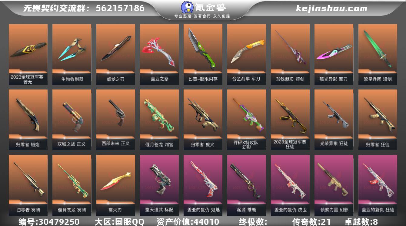 传奇数:21 卓越数:8 皮肤资产价值:44010 卖家说:多个限定,有离火刃,双城正义,23冠军