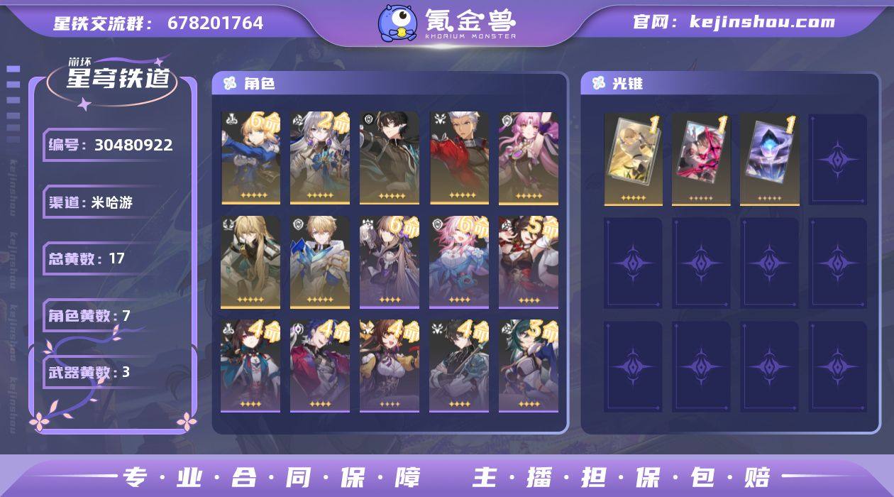 开拓等级:66 开拓者性别:女 总黄数:17 星轨专票:0 五星角色数:7 6命Saber,2命布洛妮娅,0命丹恒·腾荒,0命Archer,0命符玄,0命罗刹,0命杰帕德 五星光锥数:3 1精没有回报的加冕,1精以世界之名,1精记忆的质料 邮箱状态:送网易邮箱 卖家说:6+1saber2+0布洛妮娅
