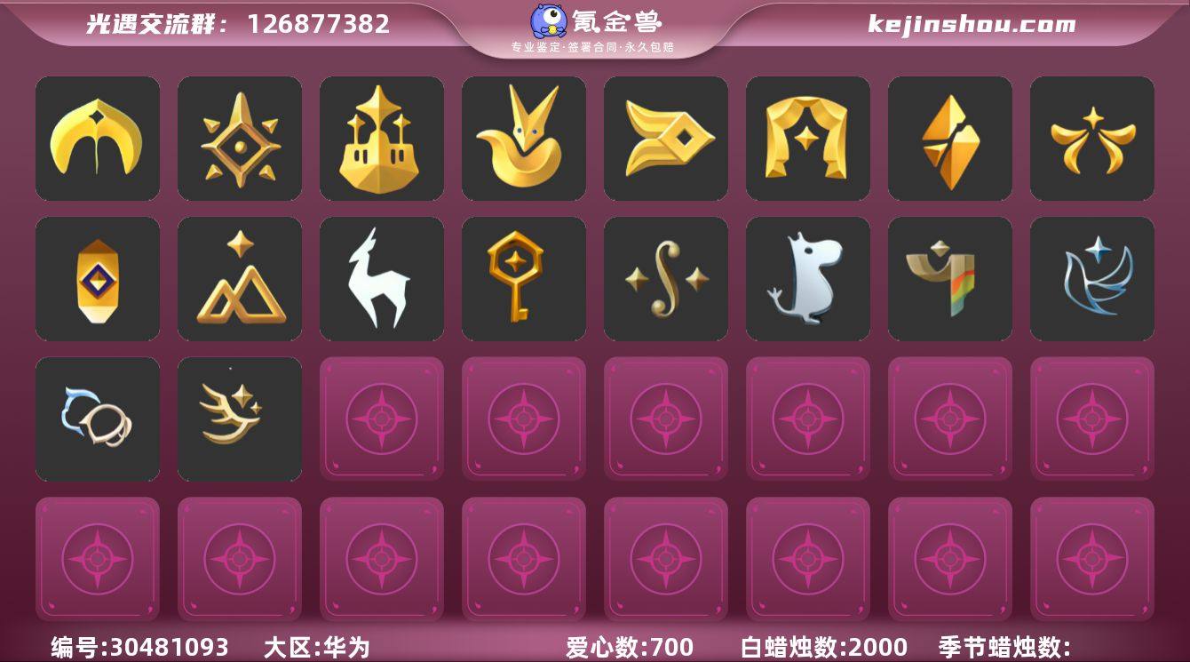 蜡烛数量:2000 爱心数量:700 翼数量:250 圣岛季,预言季,梦想季,小王子季,风行季,表演季,破晓季,欧若拉季,追忆季,拾光季,九色鹿季,筑巢季,二重奏季,姆明季,彩染季,青鸟季,双星季,迁徙季 卖家说:全活动全复刻瑕排箫和蟹语者,消费等级V8,绑有七个徽章,矮人,长大成人,云野传说,大伞,雨林先祖,圣岛传送,隐士山谷。除了隐士山谷和雨林先祖,其他的徽章都有本体,包邮送。断的都是冷门季节。百礼,不瑕绝版传送斗篷,所有传送类物品都有,联动礼包基本上都有