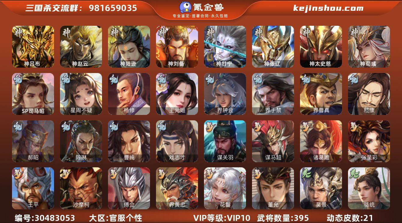 官阶:大将军;VIP等级:VIP10;史诗武将数量:52;动态皮肤数量:21;武将总数:395;史诗宝珠数量:4;将魂数量:5802;神将:10;魏国史诗武将:24;蜀国史诗武将:10;吴国史诗武将:7;群史诗武将:15 神吕布,神赵云,神陆逊,神刘备,神甘宁,神张辽,神太史慈,神荀彧,神吕蒙,神周瑜,SP司马昭,星周不疑,杨修,王元姬,界钟会,界于禁,界曹真,嵇康,郝昭,陈琳,曹纯,戏志才,谋马超,诸葛瞻,张星彩,王平,沙摩柯,傅佥,界黄忠,花鬘,董允,谋关羽,吴景,骆统,留赞,界朱然,界徐盛,界步练师,贺齐,裴秀,左慈,张让,苏飞,审配,麹义,南华老仙,沮授,界左慈,界李儒,公孙康,张绣,李傕,阎象,许攸,神郭嘉-虎年清明(动态),神荀彧-虎年清明(动态),神张辽-散敌擒孙,神甘宁-万人辟易(动态),神陆逊-绽焰摧枯(动态),神曹操-天下归心,神曹操-玄天通冥(动态),SP司马昭-鼠年冬至(动态),SP蔡文姬-兔年冬日(动态),司马懿-牛年立冬(动态),曹丕-牛年清明(动态),界司马懿-牛年立冬(动态),界曹丕-牛年清明(动态),张春华-牛年立冬(动态),钟会-谋谟之勋(动态),曹真-虎年春节(动态),界钟会-谋谟之勋(动态),曹昂-竭战麟伤(动态),曹纯-虎年春节(动态),关羽-啸风从龙(动态),关羽-明良千古(动态),马超-牛年春节(动态),赵云-牛年春节(动态),界关羽-啸风从龙(动态),界赵云-牛年春节(动态),界马超-牛年春节(动态),马云騄-牛年春节(动态),周处-义除三害(动态),陆逊-龙年七夕(动态),周瑜-免年清明(动态),孙策-长沙桓王(动态),界孙策-长沙恒王(动态),刘赞-灵魂歌王(动态),麹义-扬刀立威(动态),许攸-恃功矜能(动态),李儒-鸠杀少帝(动态),界李儒-鸠杀少帝(动态),刘协-龙困于渊(动态)
