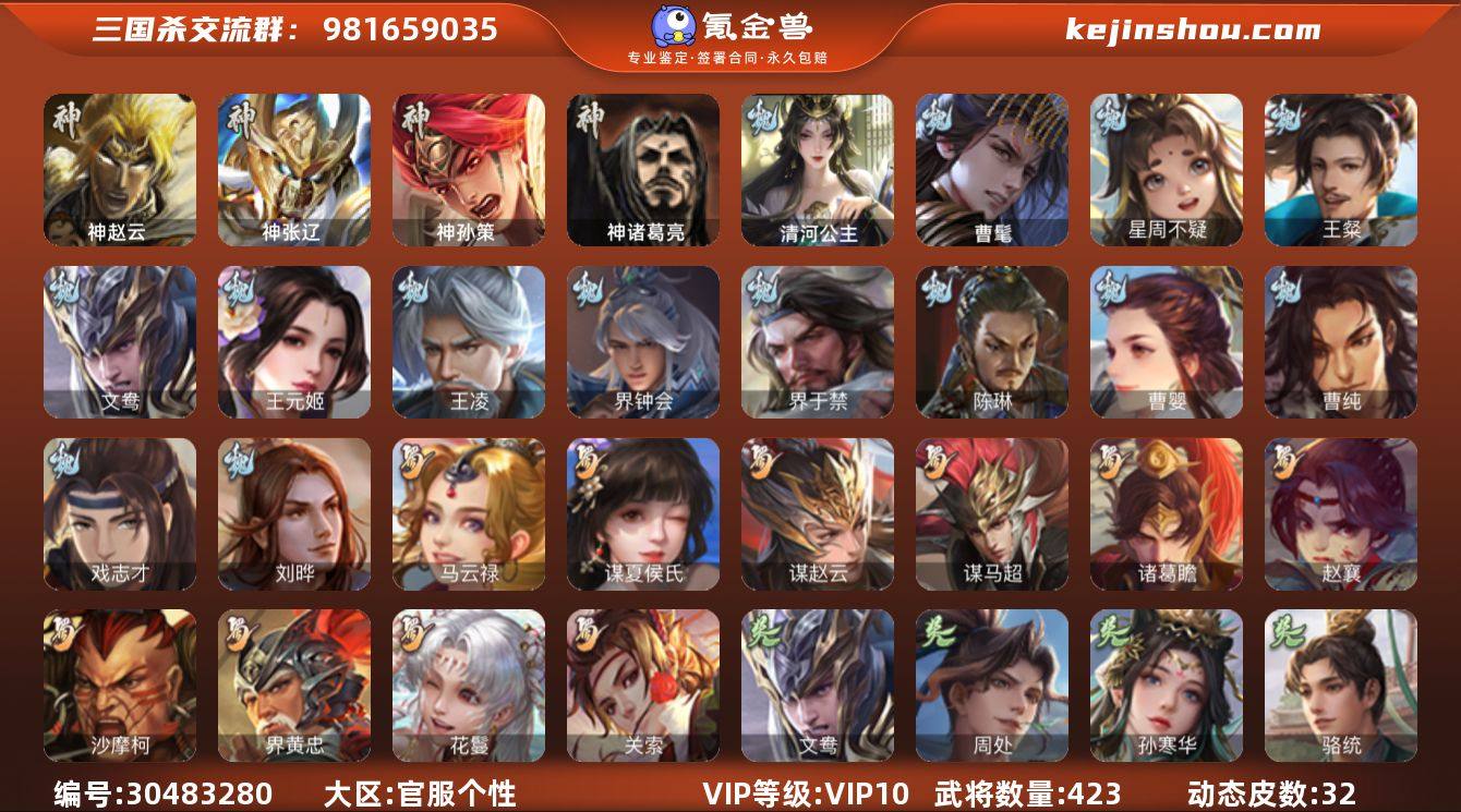 官阶:大将军;VIP等级:VIP10;史诗武将数量:53;动态皮肤数量:32;武将总数:423;史诗宝珠数量:25;将魂数量:2701;神将:6;魏国史诗武将:25;蜀国史诗武将:10;吴国史诗武将:8;群史诗武将:22 神赵云,神张辽,神孙策,神吕蒙,神周瑜,神诸葛亮,曹髦,星周不疑,王粲,文鸯,王元姬,王凌,魏-司马昭,界钟会,界于禁,陈琳,曹婴,曹纯,戏志才,刘晔,清河公主,关索,马云騄,谋夏侯氏,谋赵云,谋马超,诸葛瞻,赵襄,沙摩柯,界黄忠,花鬘,周处,孙寒华,骆统,留赞,界朱然,界徐盛,界步练师,贺齐,谋郭嘉,谋黄月英,谋貂蝉,裴秀,左慈,张让,张琪瑛,星黄忠,苏飞,麹义,沮授,界左慈,界李儒,公孙康,鲍信,谋张角,张绣,李傕,阎象,许攸,友徐庶,星董卓,神荀彧-虎年清明(动态),神赵云-鳞振九霄,神曹操-天下归心,神赵云-战龙在野(动态),神司马懿-鉴往知来(动态),曹植-龙年中秋(动态),曹丕-气荡山河(动态),甄姬-明珠耀躯(动态),曹丕-龙年中秋(动态),SP蔡文姬-兔年冬日(动态),张春华-牛年立冬(动态),曹婴-兔年春节(动态),朱灵-以战破氐(动态),王元姬-鼠年冬至(动态),司马昭-昭威淮南(动态),张辽-龙生九子(动态),星徐晃-斧引霹雳(动态),清河公主-魅影萦心(动态),马超-牛年春节(动态),马超-明良千古(动态),界马超-牛年春节(动态),赵襄-猪年春节(动态),卧龙诸葛-火烧博望(动态),周处-义除三害(动态),孙权-永开吴祚(动态),孙策-虎踞江东(动态),孙寒华-威灵尽显(动态),孙尚香-兔年春节(动态),凌统-长风破浪(动态),步练师-牛年七夕(动态),界凌统-长风破浪(动态),界步练师-牛年七夕(动态),孙茹-花容月貌(动态),刘赞-灵魂歌王(动态),文鸯-势若万钧(动态),貂蝉-舞惑群心(动态),吕布-鼠年七夕(动态),界吕布-鼠年七夕(动态),陶谦-安民护祚(动态),左慈-蛇年限定(动态)