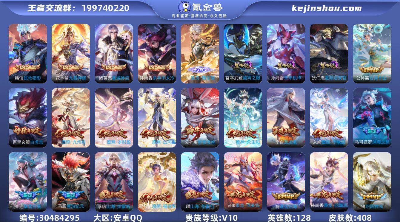 贵族等级:V10 典藏皮肤数:4 珍品无双皮肤数:0 无双皮肤数:1 珍品传说皮肤数:0 传说皮肤数:81 史诗皮肤数:127 皮肤数:408 英雄数:128 段位:钻石