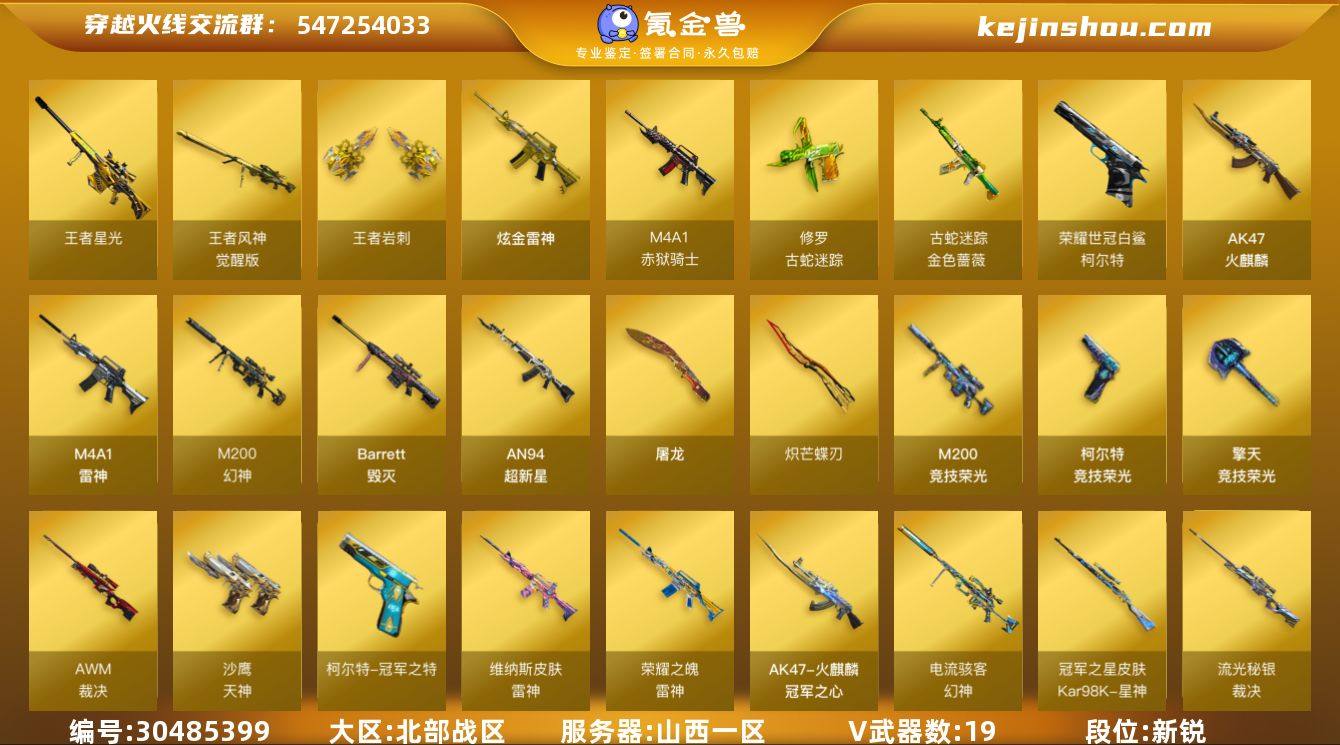 段位:新锐 V武器数:19 王者武器数:3 炫金武器数:1 王者星光,王者风神-觉醒版,王者岩刺 炫金雷神 M4A1-赤狱骑士,修罗-古蛇迷踪,金色蔷薇-古蛇迷踪,柯尔特-荣耀世冠白鲨2023,AK47-火麒麟,M4A1-雷神,M200-幻神,Barrett-毁灭,AN94-超新星,屠龙,炽芒蝶刃,M200-竞技荣光,柯尔特-竞技荣光,擎天-竞技荣光,裁决,天神,柯尔特-冠军之特 雨棠