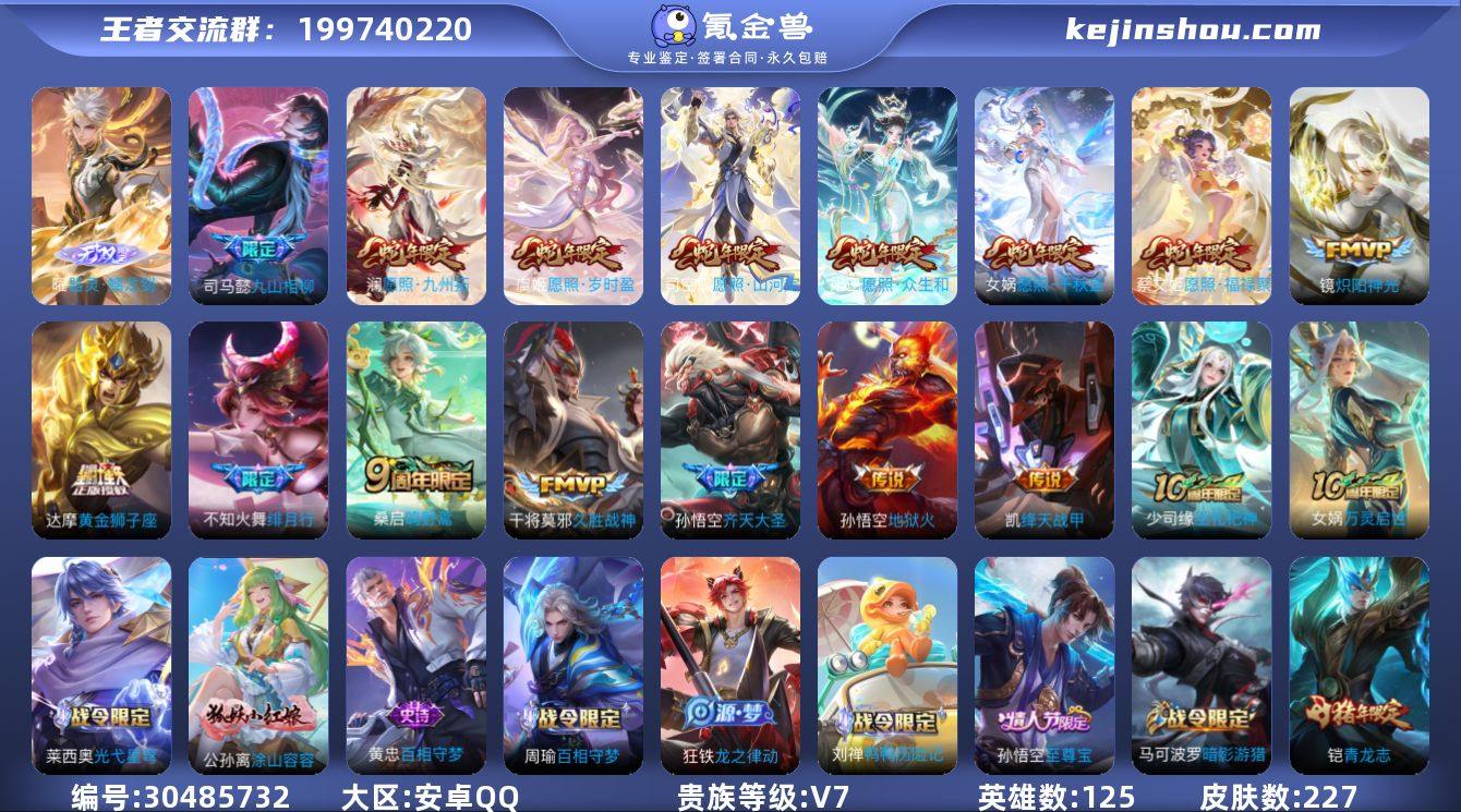 安卓手Q298区227皮0典藏16传说1无双 营地ID2131903007(可二次)V7荣耀王者 【无双皮肤】:器灵·螭龙剑【优质限定皮肤】:至尊宝【传说皮肤】:神树通天,黄金狮子座,九山相柳,愿照·福禄聚,愿照·山河定,愿照·众生和,久胜战神,愿照·千秋盛,愿照·岁时盈,愿照·九州拓,鸣野蒿,齐天大圣,绛天战甲,炽阳神光,地狱火,绯月行【史诗皮肤】:千年之狐,天才门将,黎明之约,胡桃异想国,巫礼祀神,万灵启世,光弋星穹,摇滚巨星,箭羽风息,百相守梦,德古拉伯爵,涂山容容,龙之律动,圣诞狂欢,鬼剑武藏,百相守梦,荣光圣徽,星夜王子,节奏热浪,唤灵魅影,遇见飞天,冰雪圆舞曲,特工魅影,百解令,暗隐猎兽者,江河有灵,缤纷独角兽,御风骁将,奇幻香踪,未来纪元,百相守梦,乘风破浪,星界游侠,山海·玄木吟,圣诞恋歌,无心,五谷丰年,地狱岩魂,鹰眼统帅,云间偶戏,默契交锋,偶像歌手,金属风暴,魔术师,纤云弄巧,李小龙,青龙志,舞动绿茵,迷踪丽影,黄金分割率,至尊宝,银河之约,曙光守护者,皇家上将,飞衡,驯魔猎人,繁星吟游,梁祝,狮舞东方,水果甜心,魅力维加斯,魅语,暗影游猎,蔷薇恋人,水晶猎龙者,天秀·启明,苍穹之光,鸭鸭历险记,茶境仙,器灵·浮梦炉,猫狗日记