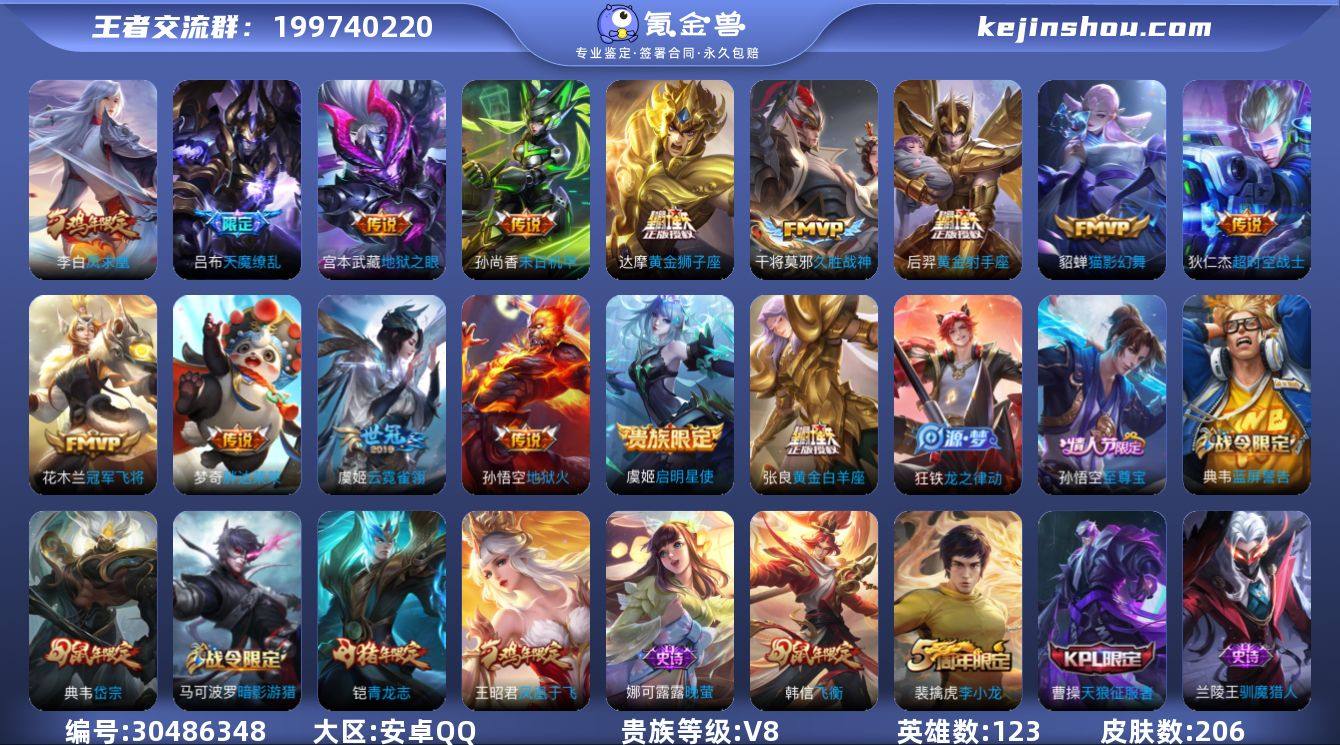 安卓手Q12区206皮0典藏15传说0无双 营地ID212016575(可二次)V8尊贵铂金II 【优质限定皮肤】:天魔缭乱,凤求凰,至尊宝【传说皮肤】:启明星使,天魔缭乱,凤求凰,地狱火,胖达荣荣,云霓雀翎,黄金白羊座,冠军飞将,猫影幻舞,超时空战士,久胜战神,末日机甲,黄金狮子座,黄金射手座,地狱之眼【特殊英雄】:嬴政,【史诗皮肤】:龙之律动,女仆咖啡,黎明之约,水晶猎龙者,幽灵船长,霸王别姬,原初追逐者,李小龙,暗影游猎,迷踪丽影,金属风暴,鬼剑武藏,银河之约,黄金分割率,岱宗,飞衡,凤凰于飞,乱世虎臣,德古拉伯爵,无限星赏官,晚萤,偶像歌手,猫狗日记,箭羽风息,天狼征服者,繁星吟游,驯魔猎人,圣诞狂欢,乘风破浪,千年之狐,特工魅影,梁祝,曙光守护者,狮舞东方,水果甜心,鹰眼统帅,蓝屏警告,魔术师,节奏热浪,白昼王子,白龙吟,暗隐猎兽者,青龙志,皇家上将,遇见飞天,至尊宝
