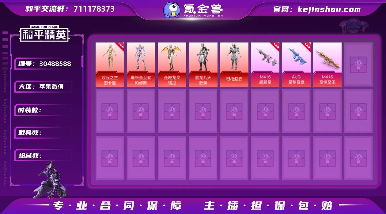 【商品标题】:苹果 微信-41粉装-37特效枪-9载具-192510热力值-19印记-303套装-442枪皮 【角色神装】:最终圣卫者-帕修斯,圣域龙灵-瑞拉,金蛇镇世-烛九,梦海之灵-妮芮妲,沙丘之主-图卡盟 【角色神装等级】:最终圣卫者-帕修斯(一级),圣域龙灵-瑞拉(一级),金蛇镇世-烛九(一级),梦海之灵-妮芮妲(一级),沙丘之主-图卡盟(六级) 【稀有载具】:宝马M4(圣保罗黄),合金龙骨(红),疾风龙骑,鬼马风驰,赤兔,星梦玉骢,护世瑞兽,晶梦灵驹,辉羽雀灵自行车 【特效枪等级】:AKM-甜心宝贝(五级),AKM-梦之光华(一级),AKM-幽焰骑士(三级),SCAR-L-童趣迷兔(五级),SCAR-L-天蓬元帅(七级),SCAR-L-金蛇镇世(三级),M416-心之恋语(一级),M416-至情至圣(七级),M416-墨龙九天(六级),GROZA-焦糖拿铁(五级),GROZA-精灵之光(三级),AUG-超新星(一级),AUG-许七安(五级),M762-冷魅冰骑(五级),蜜獾-辉耀战甲(五级),UZI-绮梦青鸾(五级),UMP45-相思残雪(五级),UMP45-宇宙意志(三级),Vector-红伞翩翩(五级),AKS-74U-星穹咏叹调(五级),P90-沙丘之主(三级),Kar98K-巳巳如意(五级),Kar98K-圣域龙灵(三级),M24-镜域双华(三级),Mk14-精灵梦叶罗丽(四级),M417-第五大道(一级),M200-梦海之灵(三级),DBS-幻影飞狐(四级),SPAS-12-蜜语绒猫(四级),DP-28-圣堂之誓(一级),DP-28-千金淑猫(四级),MG3-辉羽雀灵(三级),PKM-江南烟雨(四级),爆炸猎弓-拳皇·狂花道(四级),烟雾弹-电雾迷城(四级) 【优质套装】:粉装-极限特训,粉装-幻影战神,粉装-未来战士,粉装-怪诞乔克,粉装-深渊皇后,粉装-甜心巧克力,粉装-宝贝奶油派,粉装-天使彩虹糖,粉装-梦幻火箭,粉装-放客神游,粉装-彗云及圣,粉装-花间之火,粉装-诡面斩,粉装-冰霜白皇,粉装-炙焰红王,粉装-彩虹鹿灵,粉装-山涧鹿灵,角色-洛天依,粉装-彩虹甜...