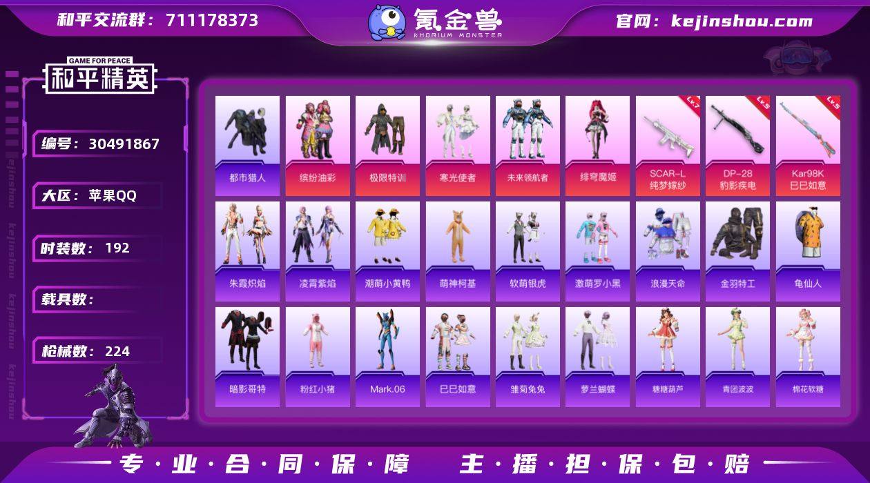 苹果【小号 缤纷油彩 浪漫天命 都市猎人 金羽特工 潮萌小黄鸭 暗影特工 蓝螳螂 SCAR-L-纯梦嫁纱(七级)】 手Q-5粉装-3特效枪-0载具-2粉色飞行器-64906热力值-14王牌印记-192套装-224枪皮 【热门品类】:粉装-缤纷油彩,套装-浪漫天命,套装-都市猎人,套装-金羽特工,套装-龟仙人,套装-潮萌小黄鸭,套装-暗影哥特,套装-粉红小猪,角色-Mark.06 【粉色套装】:粉装-极限特训,粉装-缤纷油彩,粉装-寒光使者,粉装-未来领航者,角色-绯穹魔姬 【粉色枪皮等级】:SCAR-L-纯梦嫁纱(七级),Kar98K-巳巳如意(五级),DP-28-豹影疾电(五级) 【粉色枪皮】:SCAR-L-纯梦嫁纱,Kar98K-巳巳如意,DP-28-豹影疾电 【粉色飞行器】:齐天大圣飞行器 【粉色降落伞】:甜蜜誓约降落伞,暗夜玫瑰降落伞,第五大道降落伞,星穹咏叹调降落伞,荧海星豚降落伞,灵猫魔法师降落伞 【稀有套装】:套装-龟仙人,套装-巳巳如意,套装-雏菊兔兔,套装-萝兰蝴蝶,套装-糖糖葫芦,套装-青团波波,套装-棉花软糖,角色-都市丽猫,套装-燕燕于飞,套装-鱼渊荷华,套装-粉恋花,套装-紫幽梦,套装-蓝冰羽,套装-星影赞美诗,套装-彩虹兔,套装-云朵鹅,套装-雪绒豹,角色-绛羽幽主,套装-朱霞炽焰,套装-凌霄紫焰 【稀有枪皮】:AKM-彩虹符号,AKM-影袭,AKM-灼热熔岩,AKM-虎虎生威,AKM-霓虹街区,AKM-龙的传人,M16A4-幻世战舞者,M16A4-甜心亚梦,M16A4-红色方程式,M16A4-蓝色火焰,SCAR-L-炫彩节奏,SCAR-L-玉兔迎春,SCAR-L-红色方程式,M416-动感兔斯基,M416-糯团青竹,M416-红色方程式,M416-蓝色火焰,GROZA-异彩先驱,GROZA-懵萌河马,GROZA-春暖花开,GROZA-生命誓言,GROZA-田园牧歌,GROZA-荧海星豚,AUG-天降萌叽,AUG-灵符少年,AUG-耀粉歌者,QBZ-彩虹符号,QBZ-飞驰魅影,M762-天降萌叽,M762-彩虹符号,M762-瑞龙福将,M762-...