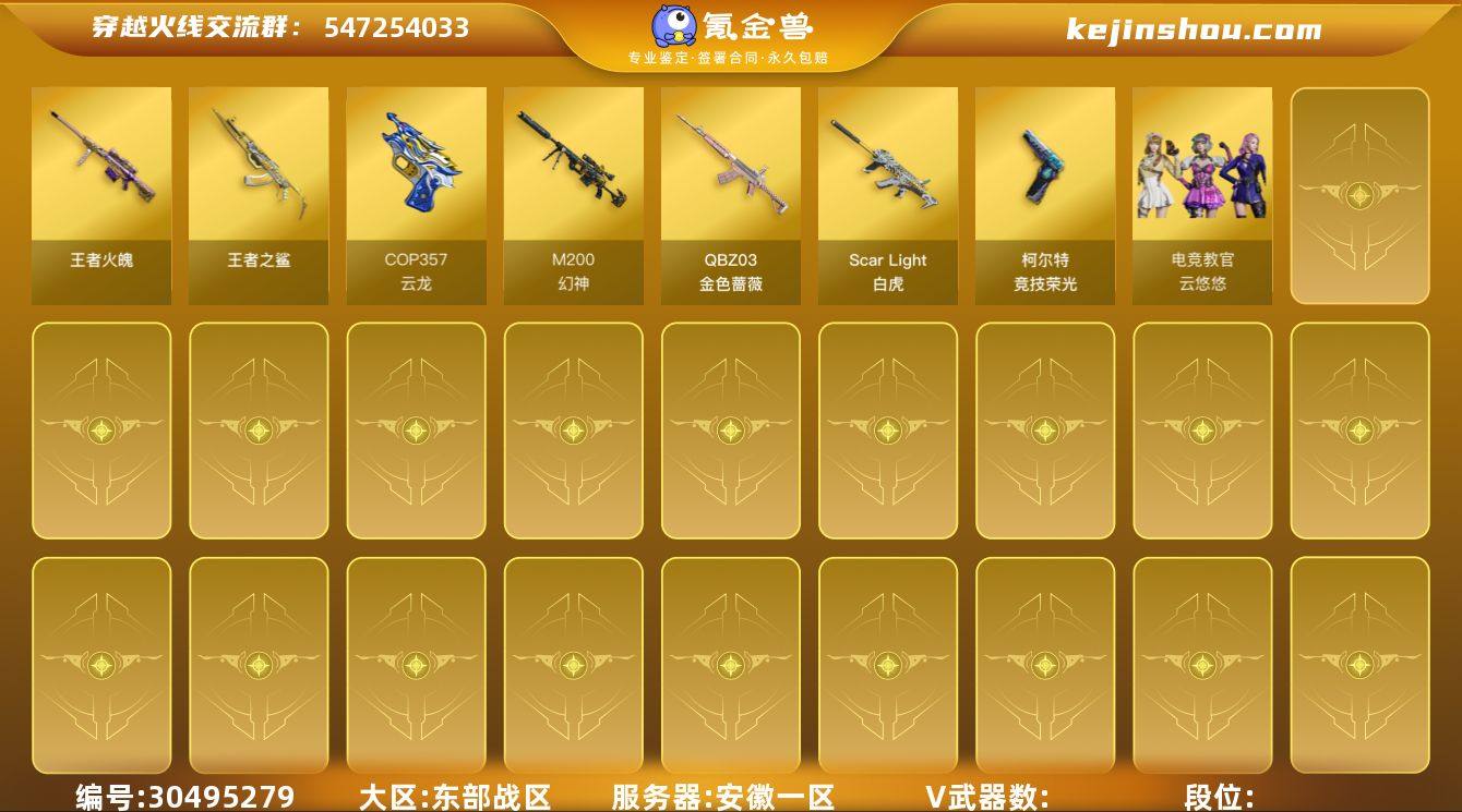 上海一区-56V-2王者武器数-1炫金武器数 【热门武器】:QBZ03-金色蔷薇,M200-幻神,金色蔷薇-古蛇迷踪,修罗-古蛇迷踪,死亡之眼,白虎-电玩蓝兔*2 【王者炫金武器】:炫金无影 【音效卡】:烈火-动感闪耀 音效卡,Barrett-碧霄极光音效卡,炼狱-百战金芒-庆典舞曲音效卡,死神-雪域霜狐-怀旧音效卡 【皮肤】:幻神-动感闪耀 皮肤,幻神-电竞之星 皮肤,金色蔷薇-电竞之星 皮肤,裁决-运输船 皮肤,裁决-胜者为王 皮肤,雷神-暗月,雷神-耀金皮肤,雷神-宇航兔皮肤,M4A1-雷神-新春神龙皮肤,雷神-云海游龙皮肤,雷神-化蛇 皮肤,M4A1-再燃火线,雷神-神秘按键 皮肤,火麒麟-百城,毁灭-暗月,毁灭-百城浙江 皮肤,毁灭-虹光风暴 皮肤,毁灭-秦师 皮肤,黑骑士-破界 皮肤,天启-高能霹雳 皮肤,HK417-朱雀-掌火灵橙 皮肤,战神-粉色甜心皮肤,战神-紫绶金章皮肤*3,战神-流金岁月皮肤*3,AK47-B-常胜将军-刘备*3,AK47-B-常胜将军-孙权,极光-高能霹雳 皮肤,极光-掌火灵耀 皮肤,修罗-百战金芒 皮肤,轻型军用手斧-再燃火线 【角色】:影豹,战地猎狐,雪域霜狐,蛇隐宗,奇洋探员,乔伊教练,修道士,云海玲珑,暗夜-X,初恋灵狐,芳心审判者,飞虎队-X,风暴女,虎妞,嘉年华灵狐,猎狐者-追月,0号玩家,灵狐者-X,灵狐者-七夕宝贝,曼陀罗-X,潘多拉-X,蛇姬,斯沃特-X,铁骑荣耀,兔囡囡,雪莉杨-摸金校尉,夜玫瑰-宠粉,游珑儿 【人偶武器】:火麒麟-灵狐,AWM-灵狐-15周年嘉年华*3,迷你深渊冰龙,迷你波特博士,迷你牛牛*2,生化手雷-机甲核心,深渊终结者手雷*2,迷你超能女侍,迷你巨石泰坦-魔花研究所 【暴走生化】:死亡之眼,超级对讲机 【挑战大师】:冰龙粉碎者-白马银枪,激光毁灭者III-白马银枪*2 【英雄级武器】:AK47-火麒麟,M4A1-雷神*2,AK12-天启,M4A1-武圣,无影-神兵利器,黑武士-锦绣...