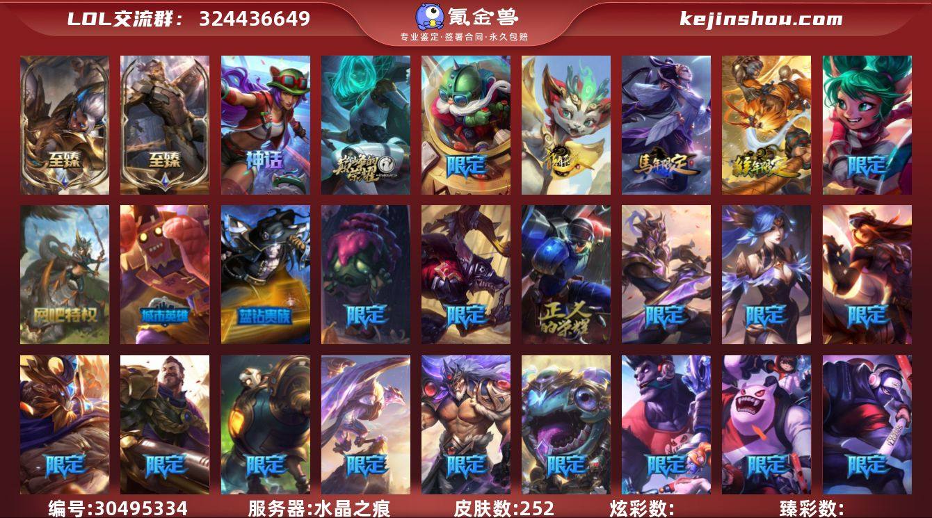 【340皮肤1神话-66限定-15传说 6年限多冰雪】未定级段位-154英雄-340皮肤-1炫彩-0终极-1神话-66限定-15传说-88史诗 【年限皮肤】:古琴余韵娑娜,醒狮克格莫,碧玉之牙卡西奥佩娅,神龙之翼库奇,美猴王孙悟空,虎痴之拳蔚 【情人节限定】:觅心女王艾希 【冰雪限定】:幸福女神乐芙兰,圣诞开心鬼提莫,圣诞精灵崔丝塔娜,圣诞狂欢努努和威朗普,圣诞糖果棒厄运小姐,阿木木“主人不要我了”,胡桃夹子萨科,平安夜女神娑娜,英勇玩具兵普朗克,邪恶圣诞老人维迦,夺命美人卡特琳娜,喜庆之树茂凯,雪默丁格,雪装奈德丽,圣诞玩偶波比,圣诞老人古拉加斯,圣诞驯鹿克格莫,魄罗骑士瑟庄妮,冰雪节辛吉德,冰雪节玛尔扎哈,冰雪兽纳尔 【神话皮肤】:十周年纪念安妮 【限定皮肤】:诺斯费拉图弗拉基米尔,冠军之刃锐雯,冠军典狱长锤石,冠军之刃锐雯2016,暗杀星蒙多,暗杀星努努和威朗普,暗杀星慎,SKTT1贾克斯,SKTT1劫,SKTT1婕拉,SSW辛吉德,SSW图奇,SSW雷恩加尔,勇敢的心德莱厄斯,电玩女神厄运小姐,玉剑传说无影,胜利女神希维尔,胜利之树茂凯,胜利枪神格雷福斯,海贼瑞兹,南瓜头费德提克,鬼影森森茂凯,魅惑女巫奈德丽,糖果使徒费德提克,泳池派对李青,机械迷城加里奥,蓝色忧郁崔斯特,蒙多蒙多,女猎手希维尔,外星装甲库奇,暗影沃里克,野兽猎人德莱文,波比的巧克力工坊,都铎王朝图奇,钢铁之翼艾尼维亚,红桃杰克崔斯特,防暴士兵辛吉德,防暴天使凯尔 【传说皮肤】:魔幻卡牌崔斯特,钢铁之翼凯尔,源计划林易,约德尔国队长提莫,欧米伽小队幽灵特工,恶魔之刃泰达米尔,战地巨兽科加斯,上古战魂魔腾,神龙尊者圣龙李青,银河魔装机神兰博,第三类接触黑默丁格,死亡骑士盖伦,钢铁军团盖伦,黯黑魔龙希瓦娜,蔷薇绅士杰斯 【史诗皮肤】:冰霜烈焰安妮,科学怪熊的新娘安妮,皇家火枪...