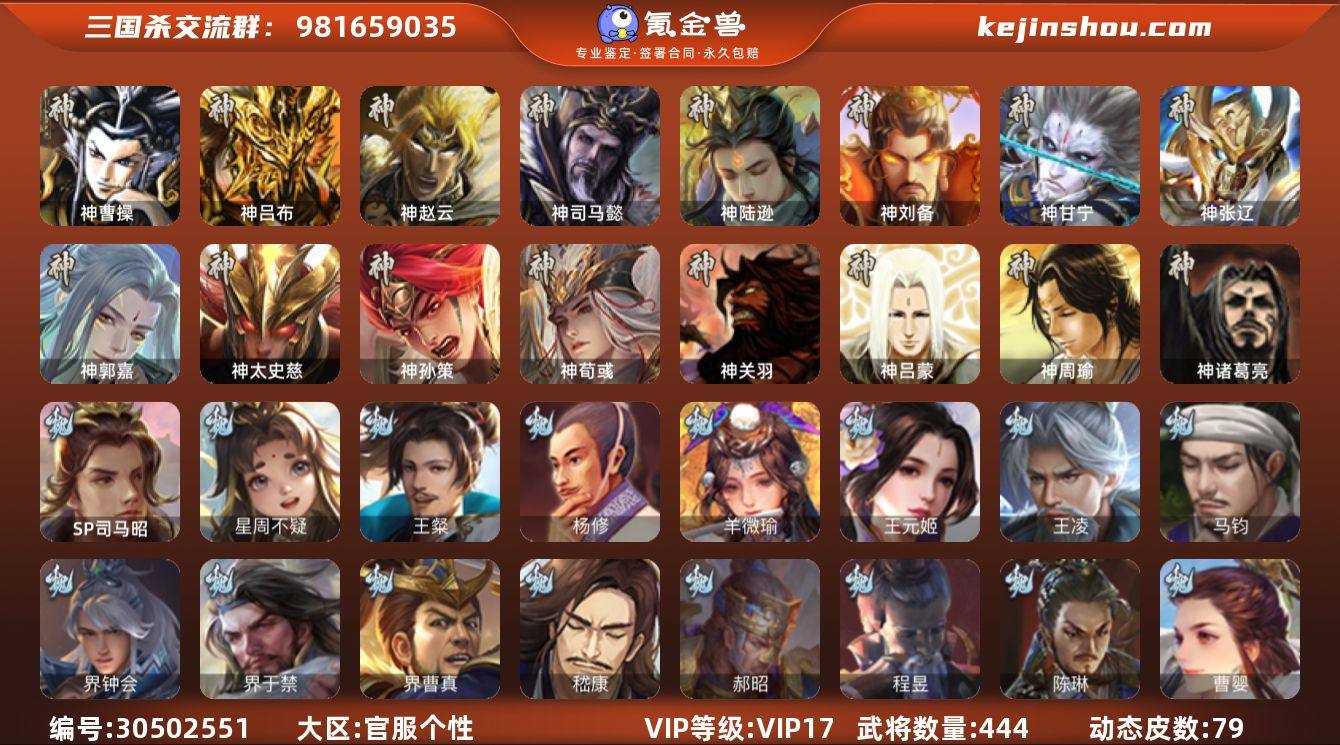 VIP等级: VIP17 官阶: 大将军 武将数量: 444 动态皮肤数量: 79 神将: 神曹操,神甘宁,神郭嘉,神刘备,神陆逊,神吕布,神司马懿,神孙策,神太史慈,神荀彧,神张辽,神赵云,神关羽,神吕蒙,神周瑜,神诸葛亮 魏国武将: 刘晔,戏志才,曹纯,曹婴,陈琳,程昱,郝昭,嵇康,界曹真,界于禁,界钟会,马钧,王凌,王元姬,羊徽瑜,杨修,王粲,唐咨-魏,张辽,SP蔡文姬,SP曹仁,SP关羽,SP贾诩,SP姜维,SP庞德,卞夫人,蔡贞姬,曹昂,曹操,曹冲,曹洪,曹丕,曹仁,曹叡,曹嵩,贾逵,王异,张恭,鲁芝,界满宠,曹休,界曹植,满宠,荀攸,王基,钟繇,蒯越蒯良,郭嘉,荀彧,阮慧,杜畿,界郭嘉,崔琰,界曹丕,界荀彧,朱灵,界甄姬,吕虔,界王异,界许褚,界郭淮,华歆,陈群,界邓艾,界典韦,袁涣,李通,乐进,辛宪英,郭淮,毛玠,郭皇后,毌丘俭,夏侯惇,曹植,司马朗,谋于禁,界曹操,星周不疑,许褚,界张辽,张郃,钟会,文聘,曹彰,界夏侯惇,诸葛诞,司马懿,甄姬,界徐晃,徐晃,界曹仁,孙资刘放,韩浩史涣,胡班,曹真,典韦,界夏侯渊,夏侯渊,李典,于禁,王双,邓艾,界司马懿,张春华,孟达-魏,臧霸,牛金,朱灵(国战),SP司马昭,董昭,谋夏侯渊 蜀国武将: 董允,关索,花鬘,界黄忠,沙摩柯,王平,张星彩,赵襄,周群,诸葛瞻,谋马超,谋赵云,马云騄,徐庶,界魏延,杨仪,吕凯,界关羽,界诸葛亮,邓芝,界伊籍,胡金定,费祎,严颜,界黄月英,界张嶷,赵云,张松,彭羕,李丰,界刘备,界刘禅,谋姜维,刘封,糜竺,谋庞统,黄月英,刘巴,关羽,王甫赵累,吴懿,吴班,界吴懿,界廖化,祝融,张飞,黄皓,陈震,魏延,界周仓,谋祝融,马忠,界法正,糜夫人,界孟获,刘禅,界赵云,界姜维,张翼,关银屏,界祝融,SP孙尚香,SP徐庶,卧龙诸葛,宗预,周仓,简雍,谋孟获,界关兴张苞,诸葛亮,孙乾,界张飞,界卧龙诸葛,法正,界简雍,赵统赵广,陈到,界马岱,关平,马岱,界庞统,庞统,诸葛果,谋张飞,马谡,马超,来敏,廖化,关兴张苞,孟获,秦宓,吴苋,夏侯氏,姜维,黄忠,刘备,界马超,李严,...