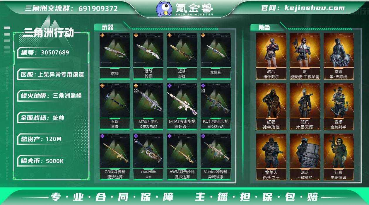 总资产:120M 哈夫币:5000K 烽火地带等级:60 烽火地带段位:三角洲巅峰 全面战场等级:60 全面战场段位:统帅 骇爪-维什戴尔,蛊-能天使·午夜邮差,露娜-黑·天际线,红狼-蚀金玫瑰,骇爪-水墨云图 露娜-金牌射手,牧羊人-街头之王,深蓝-不破誓约,红狼-电锯惊魂,威龙-飞虎,威龙-壮志凌云,威龙-铁面判官,蜂医-送葬人·无题密令 信条,怜悯,影锋,北极星,黑海 卖家说:全皮肤账号,徽章都有,成就很多