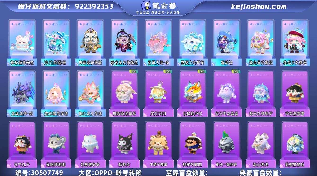暗夜皇女德茜拉,独角兽芬妮亚,浪花黛露珊,龙魂战神-烬,棉花糖芙米拉,神裁者安努斯,鲨莉娃,圣翼天使-恋,焰心龙女芙瑞,雪原之心伊芙,执笔少女露离,烛光精灵夜清 北极狐卢比,宝石甲龙晶晶,极光女神典伊,剧院首席露希,灵灯闪闪,白菜狗,北极兔卢米,北极熊安安,菠萝吹雪,菠萝苏苏,巴斯光年蛋,八音盒温妮,菜鸟笨笨,橙留香,催眠师困困,茨木童子,草莓熊蛋,超燃蛋小黄,超燃蛋小绿,仓鼠米仔,大娃,大耳狗,大灰狼,道具师芙芙,电竞主播艾莉,DongDong,袋鼠嘟宝,发美美,沸羊羊,古董商,盖碗茶青青,旱獭,海绵宝宝蛋,虎皮卷大灰狼,胡桃可露丽,航天员莱卡,红小豆,海藻偷偷,江户川柯南,甲龙晶晶,僵尸博士,吉他手卡萝,街头一霸骐哥,机械鼓手贝克,机械师维迪,酷洛米,梨花诗,铃兰三月兔,流浪小象哆哆,狸猫大力,蓝舞鞋瑞拉,蓝樱爱丽丝,鲤鱼姬小锦,懒羊羊,狼执事柯尔特,面包狗松松,蜜蜂DongDong,梅海海,莓莓DongDong,木偶波露,魔灯闪闪,美羊羊,宁红夜,苹果派雪雪,貔貅福福,企鹅心心,饶舌诗人,饶舌小子,水波蛋,松饼小红帽,上官子怡,三角龙小萨,赛罗,水母尤莱亚,松鼠多粟,松山山,失心熊,泰菲,天狗刑云,兔露露,淘气丸子,涂山浅浅,豚豚服务员,甜心猫萝拉,舞女洛弥诗,喜宝儿,熊大,熊二,雪怪瓦图鲁,小灰灰,小红帽,暹罗猫,熊猫岁岁,仙人掌丘丘,小狮子图蒙,小太阳葵葵,雪王,星云咩咩,小演员露希,洗澡DUCKOO,小猪妖,鸭鸭DongDong,云村音音,幽灵猫妮莎,元气丸子,鹰神霍路隼,吟游诗人弥亚,圆圆子,赞萌露比,仔仔熊,猪猪侠 段位:无敌凤凰蛋 卖家说:有四羊和dongdong名片资料卡 多热门IP联名 红小豆 旱獭 奥利奥 阿尔卑斯 趣多多 限定背饰碎晶 18万潮流大衣柜(退游前基本典藏全齐 12至臻) 历史无敌前三百 高校联赛两届省战队称号 累冲差两千拿翅膀 有小古早表情头像框昵称框