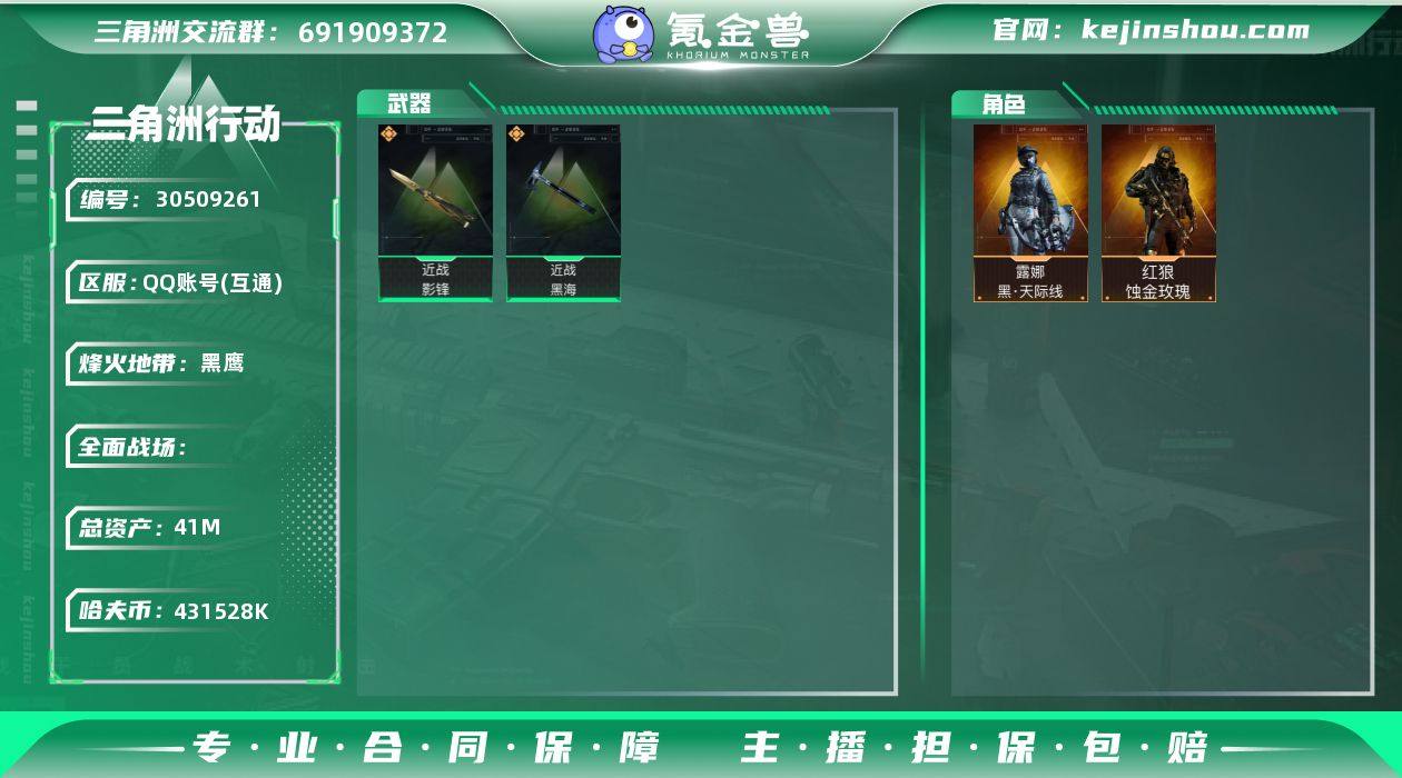 总资产:41M 哈夫币:431528K 烽火地带等级:60 烽火地带段位:黑鹰 露娜-黑·天际线,红狼-蚀金玫瑰 影锋,黑海