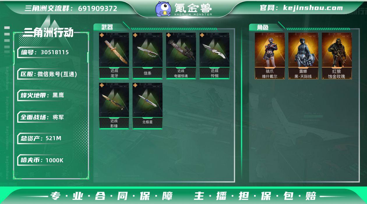 总资产:521M 哈夫币:1000K 烽火地带等级:60 烽火地带段位:黑鹰 全面战场等级:50 全面战场段位:将军 骇爪-维什戴尔,露娜-黑·天际线,红狼-蚀金玫瑰 龙牙,信条,电锯惊魂,怜悯,影锋,北极星 卖家说:满刀皮,三红皮,还有4.9万三角券下赛季红皮刀皮可以直接入手,特勤出除了潜水其他满级十级仓库,四把砖皮图片有
