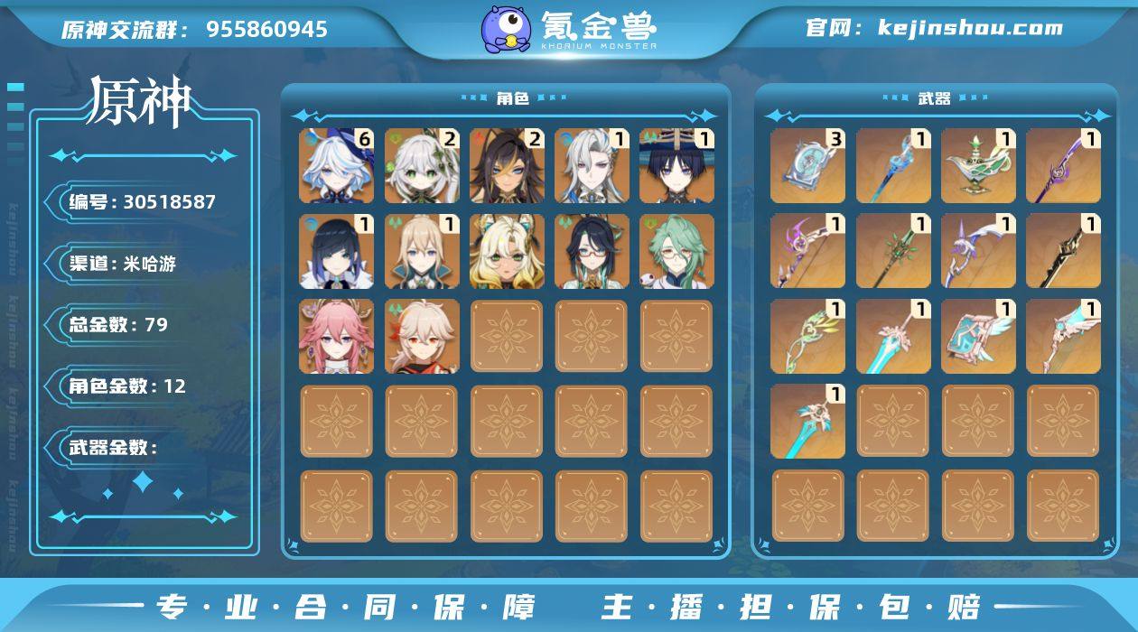 冒险等级:60 总黄数:125 5星角色数:34 5星武器数:34 原石数量:11 纠缠之源数量:14 6命芙宁娜,6命莱欧斯利,6命那维莱特,5命提纳里,4命刻晴,4命迪卢克,4命七七,2命哥伦比娅,2命白术,2命琴,1命梦见月瑞希,1命夜兰,1命魈,1命胡桃,1命莫娜,0命玛薇卡,0命恰斯卡,0命希诺宁,0命玛拉妮,0命希格雯,0命闲云,0命娜维娅,0命林尼,0命纳西妲,0命赛诺,0命神里绫人,0命申鹤,0命珊瑚宫心海,0命宵宫,0命神里绫华,0命枫原万叶,0命优菈,0命温迪,0命迪希雅 6命班尼特,6命嘉明,6命久岐忍,6命琳妮特,6命蓝砚,6命绮良良,6命赛索斯,6命香菱,6命行秋,6命夏洛蒂,6命夏沃蕾,6命伊法,6命北斗,6命重云,6命迪奥娜,6命多莉,6命珐露珊,6命菲谢尔,6命九条裟罗,6命卡维,6命坎蒂丝,6命柯莱,6命雷泽,6命罗莎莉亚,6命鹿野院平藏,6命米卡,6命诺艾尔,6命凝光,6命砂糖,6命托马,6命五郎,6命辛焱,6命烟绯,6命瑶瑶,6命云堇,6命早柚,5命莱依拉,4命菲米尼,4命芭芭拉,2命卡齐娜,2命凯亚,1命欧洛伦,1命伊安珊,1命丽莎,0命爱诺,0命安柏 精3碧落之珑,精3阿莫斯之弓,精2静水流涌之辉,精2金流监督,精2万世流涌大典,精2护摩之杖,精2和璞鸢,精2狼的末路,精2风鹰剑,精1帷间夜曲,精1支离轮光,精1寝正月初晴,精1山王长牙,精1冲浪时光,精1赦罪,精1鹤鸣余音,精1裁断,精1最初的大魔术,精1裁叶萃光,精1千夜浮梦,精1圣显之钥,精1波乱月白经津,精1飞雷之弦振,精1雾切之回光,精1苍古自由之誓,精1终末嗟叹之诗,精1天空之傲,精1天空之卷,精1天空之刃,精1四风原典 100%侦察骑士,古恩希尔德的传承,帆影游风,花时来信,冷花幽露,倩影游侠,岁夜欢哗,星与月之约,雨化竹身,叶隐芳名,致教会自由人 卖家说:强度号,轻松过N6,本期幻化武器已拿。满命芙芙,满命龙王,满命莱欧斯利