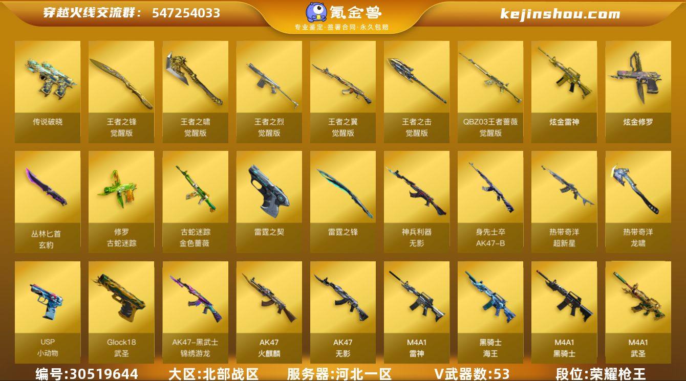 段位:荣耀枪王 VIP等级:VIP6 V武器数:53 王者武器数:6 炫金武器数:2 传说破晓 王者之锋-觉醒版,王者之啸-觉醒版,王者之烈-觉醒版,王者之翼-觉醒版,王者之击-觉醒版,QBZ-03-王者蔷薇-觉醒版 炫金雷神,炫金修罗 丛林匕首-玄豹,修罗-古蛇迷踪,金色蔷薇-古蛇迷踪,雷霆之契,雷霆之锋,无影-神兵利器,AK47-B-身先士卒,超新星-热带奇洋,龙啸-热带奇洋,USP-小动物,Glock18-武圣,AK47-黑武士-锦绣游龙,AK47-火麒麟,AK47-无影,M4A1-雷神,黑骑士-海王,M4A1-黑骑士,M4A1-武圣,白虎-电玩蓝兔,M200-幻神,Barrett-毁灭,Barrett-极光,AWM-天龙,Kar98k-星神,AK12-天启,AN94-超新星,屠龙,麒麟刺,炽芒蝶刃,M200-竞技荣光,柯尔特-竞技荣光,USP-雷暴,擎天-竞技荣光,AK47-B-常胜将军,Barrett-暗月传说,斩神刀-雷暴,幻灵之锋,AK47-B-战士,AK-47-猩红传说,裁决,天神,G36C-幻影,烈火-动感闪耀,天神-动感闪耀,屠龙-动感闪耀,屠龙-云海游龙,擎天-云海游龙 传说影煞 王者凌霄 炽天使,关小雨,魅影,晴雅,隼,雾萌萌,炫 M200-幻神音效卡,M4A1-黑骑士音效卡,Barrett-毁灭音效卡,AK47-火麒麟音效卡 卖家说:爆破生化双全装,天袭,三角洲蛊骇爪双红皮,可小刀