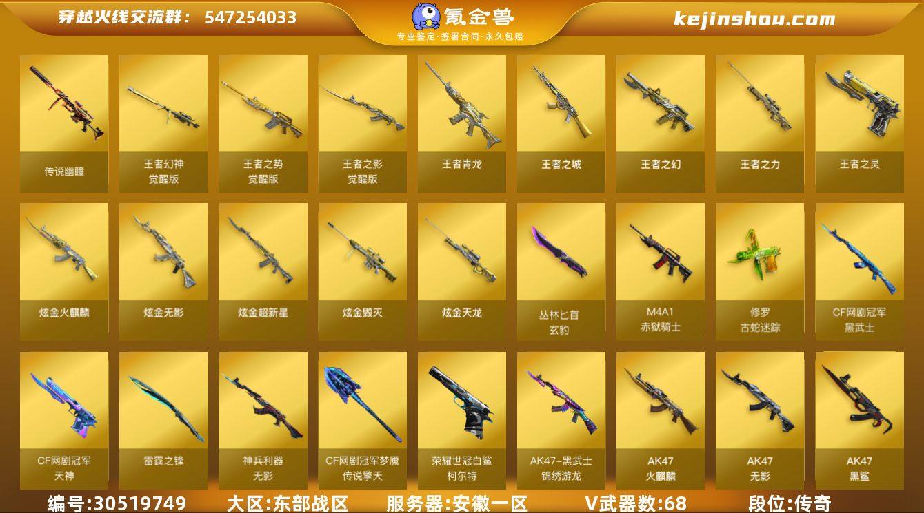 段位:传奇 VIP等级:VIP6 V武器数:68 王者武器数:9 炫金武器数:6 传说幽瞳 王者幻神-觉醒版,王者之势-觉醒版,王者之影-觉醒版,王者青龙,王者之城,王者之幻,王者之力,王者之灵 炫金火麒麟,炫金无影,炫金超新星,炫金毁灭,炫金天龙 丛林匕首-玄豹,M4A1-赤狱骑士,修罗-古蛇迷踪,黑武士-CF网剧冠军,天神-CF网剧冠军,雷霆之锋,无影-神兵利器,擎天-CF网剧冠军,柯尔特-荣耀世冠白鲨2023,AK47-黑武士-锦绣游龙,AK47-火麒麟,AK47-无影,AK47-黑鲨,AK47-黑武士,M4A1-雷神,M4A1-黑骑士,M4A1-死神,M4A1-黑龙,M4A1-夜魔,M4A1-龙血,M4A1-武圣,M4A1-千变,Barrett-毁灭,Barrett-极光,Barrett-朱雀,AWM-天龙,Kar98k-星神,AA-12-雷霆,AK12-天启,9A91-烈火,屠龙,龙啸,麒麟刺,擎天,炽芒蝶刃,M200-竞技荣光,柯尔特-荣耀世冠,柯尔特-竞技荣光,USP-雷暴,擎天-竞技荣光,龙啸-荣耀世冠,幻灵之锋,AK47-B-战士,AK47-B-战神,AK-47-猩红传说,裁决,天神,雷神-荣耀世冠,火麒麟-荣耀世冠 王者-零 电竞教官-云悠悠,葵,迷迭香,晴雅,瞳,樱,雅典娜,战地猎狐 AWM-裁决音效卡,M4A1-黑骑士音效卡,Barrett-毁灭音效卡,M4A1-雷神音效卡,AK47-火麒麟音效卡
