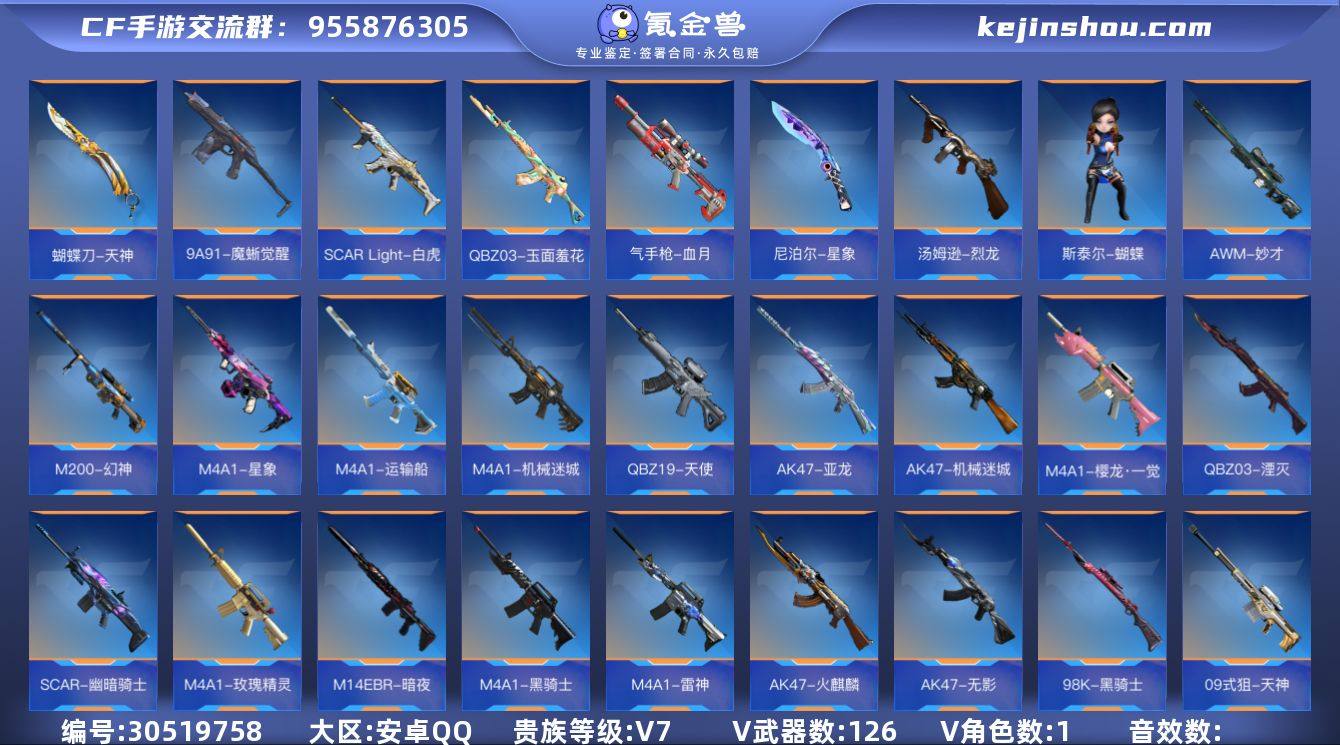 1英雄角色数-125英雄武器数【王者系列】:王者之势,王者之影,王者之心,王者之锋,王者之迹,王者之魂,王者幻神,王者之霆,王者之破,王者之业,王者之竞,QBZ03-王者蔷薇【热门武器】:COP 357-安琪拉,M4A1-星象,M200-幻神,AWM-妙才,81式-阿波罗【角色】:步练师【英雄武器】:AK47-无影,AK47-火麒麟,AK47-机械迷城,AK47-亚龙,M4A1-雷神,M4A1-黑骑士,M4A1-玫瑰精灵,M4A1-星象,M4A1-樱龙·一觉,M4A1-机械迷城,M4A1-运输船,M4A1-猎神,SCAR-幽暗骑士,SCAR Light-白虎,SCAR-心动PICK,9A91-魔蜥觉醒,M14EBR-暗夜,QBZ03-湮灭,QBZ03-玉面羞花,QBZ19-天使,QBZ191-封神榜,AWM-妙才,巴雷特-毁灭*2,巴雷特-极光,M200-幻神,09式狙-天神,98K-黑骑士,MG3-雏凤,加特林-堡垒*3,MK5-机械纪元,汤姆逊-烈龙*2,双持斯泰尔-天使,斯泰尔-蝴蝶*2,地狱烈炎,M1216-血月,Origin12-机变奇蛇觉醒,USP-神罚,沙鹰-火麒麟,沙鹰-无影,双持沙鹰-亚龙,气手枪-血月,沙鹰-宇航兔兔,蟒蛇-鼓龙,双持GLOCK18-本初,COP 357-安琪拉,QSZ92-天使,蝴蝶刀-天神,女皇利刃-铁胆虎魄,清刚-觉醒,龙啸,战斧-无影,屠龙,尼泊尔-火麒麟,尼泊尔-星象,双持尼泊尔-亚龙,龙鳞-觉醒,星芒,马来剑-毁灭,唐刀-大唐荣耀,双截棍-金色蔷薇,双截棍-天使,破邪蛇棍觉醒,马来剑-耀金伯爵
