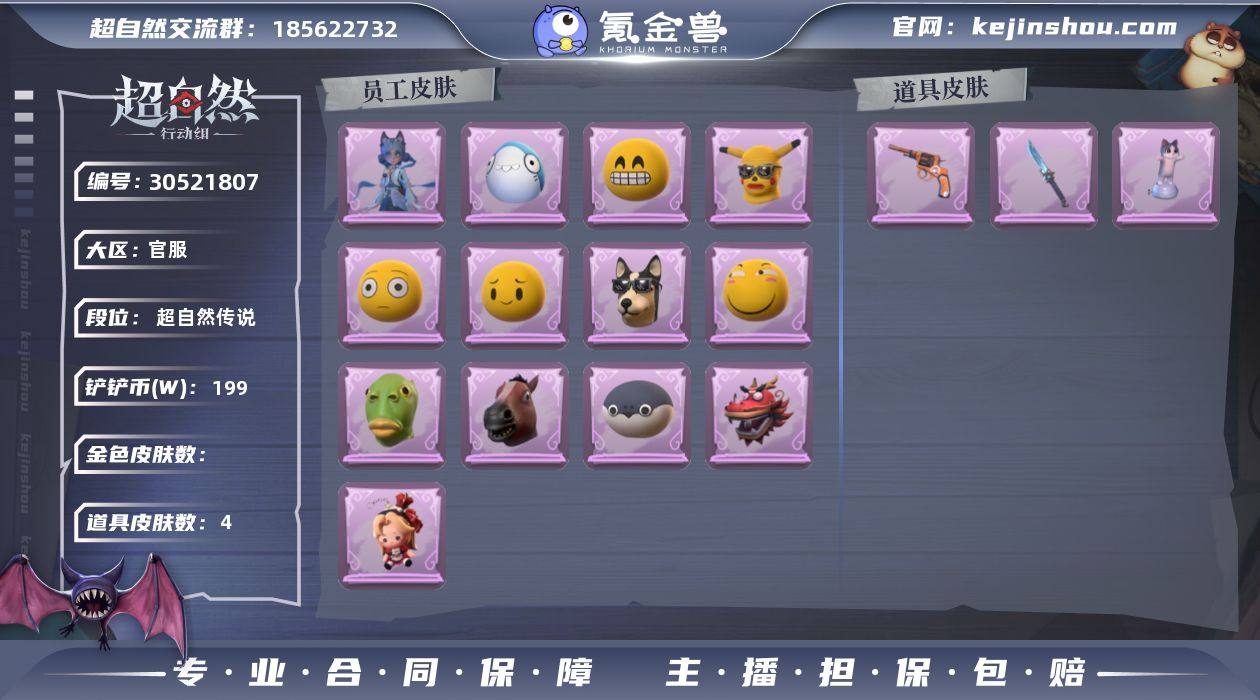 046紫色皮肤数量: 1 道具皮肤数量: 4 段位: 超自然传说 员工: 逍遥,薇薇安,巫铃儿,莉莉,阿念,小黄,零,爱丽丝,爱德华 外观: 青丘一梦,嘻嘻头套,烈焰红唇头套,呆滞头套,卑微头套,哈士奇头套,滑稽头套,鱼头怪头套,面具马头套,萨卡班甲鱼头套,龙傲天头套,小小玛丽,太空鲨头套