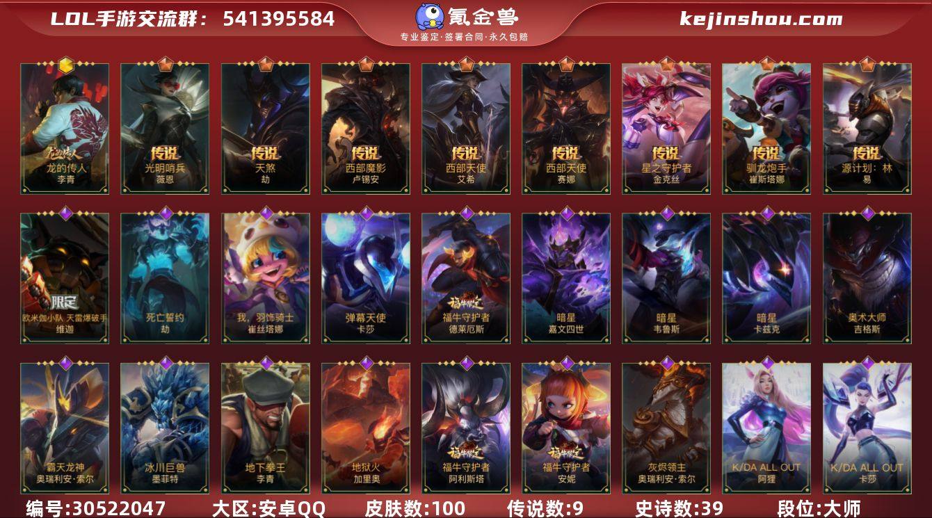 皮肤数:100 典藏皮肤数量:0 神话皮肤数量:1 传说皮肤数量:9 史诗皮肤数量:39 龙的传人 段位:大师