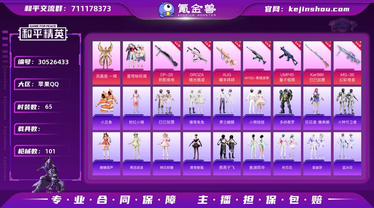 苹果【小号/小丑鱼/2粉装-7特效枪】 手Q--28189热力值-4王牌印记-65套装-101枪皮 【热门品类】:套装-小丑鱼,套装-粉红小猪 【粉色套装】:角色-凤凰座 一辉,粉装-星穹咏叹调 【粉色枪皮等级】:GROZA-镜光银凌(五级),AUG-暖羊咩咩(五级),M762-青锋波束(五级),UMP45-量子极限(五级),Kar98K-巳巳如意(五级),DP-28-豹影疾电(五级),MG-36-幻彩电音(五级) 【粉色枪皮】:GROZA-镜光银凌,AUG-暖羊咩咩,M762-青锋波束,UMP45-量子极限,Kar98K-巳巳如意,DP-28-豹影疾电,MG-36-幻彩电音 【粉色降落伞】:精灵梦叶罗丽降落伞,未来领航者降落伞,临安公主降落伞,智耀战神降落伞 【稀有套装】:套装-巳巳如意,套装-雏菊兔兔,套装-萝兰蝴蝶,套装-小熊娃娃,角色-多纳泰罗,角色-狂花道·雅典娜,套装-火种守卫者,套装-糖糖葫芦,套装-青团波波,套装-棉花软糖,角色-摩登魅猫,套装-燕燕于飞,套装-鱼渊荷华,套装-粉恋花,套装-紫幽梦,套装-蓝冰羽 【稀有枪皮】:AKM-破晓战魂,SCAR-L-夜灯,SCAR-L-炫彩节奏,SCAR-L-黄金龙骨,M416-蓝色火焰,AUG-耀粉歌者,QBZ-彩虹符号,M762-天降萌叽,M762-彩虹符号,蜜獾-天降萌叽,UZI-啾咪啾咪,UZI-天降萌叽,UZI-月影灵韵,UMP45-夜灯,P90-巳巳如意,AWM-黄金龙骨,SKS-迅猛狂鲨,AMR-墨龙九天,S686-彩虹符号,S686-生命誓言,S686-巳巳如意,S12K-玩趣呆呆,S12K-夜灯,M249-破晓战魂,DP-28-彩虹符号,MG3-妙红点点,破片手榴弹-巳巳如意 【其他套装】:套装-SS29特训,套装-幻影武者,套装-战地督导,套装-暗金炫舞,套装-暗黑骑手,套装-森林游猎者,套装-海岛探路者,套装-特训学院,套装-玉兔迎春,套装-王牌教练,套装-白熊同盟,套装-白色伏地魔,套装-竞技名士,套装-粉红小猪,套装-缤纷果语,套装-蓝色运动,套装-长空猛禽,套装-魅力单车,套装-...