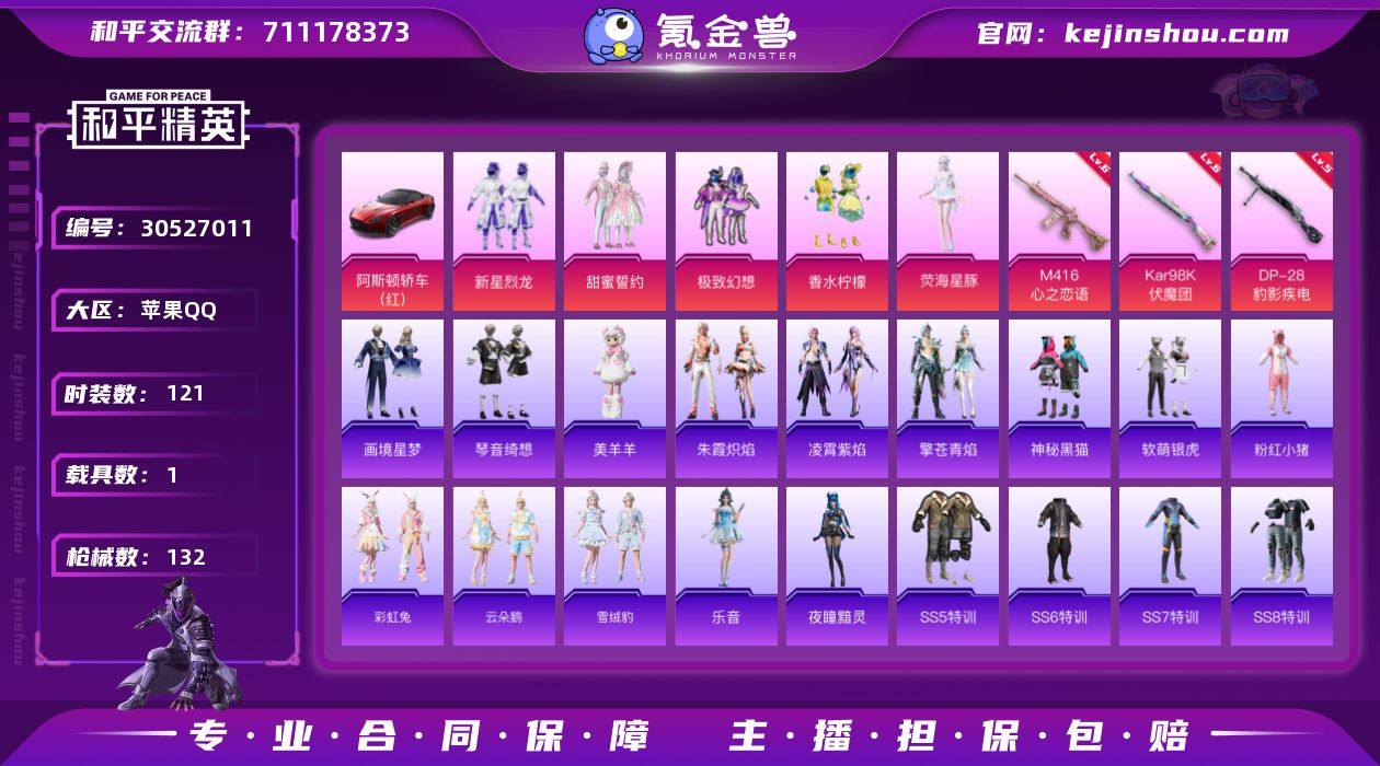 苹果 手Q-5粉装-3特效枪-1载具-2粉色飞行器-45331热力值-4王牌印记-121套装-132枪皮【热门品类】:套装-粉红小猪【粉色套装】:粉装-新星烈龙,粉装-甜蜜誓约,粉装-极致幻想,粉装-香水柠檬,角色-荧海星豚【粉色枪皮等级】:M416-心之恋语(六级),Kar98K-伏魔团(六级),DP-28-豹影疾电(五级)【粉色载具】:阿斯顿马丁DBS(红)【粉色枪皮】:M416-心之恋语,Kar98K-伏魔团,DP-28-豹影疾电【粉色飞行器】:萌物绒绒飞行器【粉色降落伞】:极限特训降落伞,神秘黑猫降落伞,甜蜜誓约降落伞,绯穹魔姬降落伞,炫彩糖果降落伞【稀有套装】:套装-彩虹兔,套装-云朵鹅,套装-雪绒豹,角色-乐音,角色-夜瞳黯灵,套装-朱霞炽焰,套装-凌霄紫焰,套装-擎苍青焰,玩偶服-美羊羊,套装-画境星梦,套装-琴音绮想,套装-炫彩糖果【稀有枪皮】:AUG-冰晶雪宝,AKM-四圣焕新,AKM-夜灯,AKM-灼热熔岩,AKM-萌趣颜团子,AKM-霓虹街区,M16A4-机械英豪,M16A4-红色方程式,SCAR-L-红色方程式,M416-夜灯,M416-潮汐统领,M416-神秘黑猫,M416-红色方程式,GROZA-生命誓言,GROZA-荧海星豚,QBZ-原初圣火,QBZ-神秘黑猫,M762-彩虹甜喵,M762-深海曼妙,M762-牛气冲天,M762-云朵鹅,G36C-不夜海上花,蜜獾-天降萌叽,蜜獾-绯穹魔姬,ACE32-画境星梦,ARX-凌霄紫焰,UZI-众神之王,UZI-古堡领主,UZI-红色方程式,UMP45-春暖花开,UMP45-生命誓言,UMP45-金玉无双,Vector-PEL轰鸣竞梦者,Vector-彩虹符号,Vector-生命誓言,汤姆逊-勇闯险境,野牛-机械英豪,MP5K-众神之王,MP5K-甜蜜誓约,MP5K-画境星梦,JS9-凌霄紫焰,Kar98K-勇闯险境,Kar98K-彩虹符号,Kar98K-红色方程式,M24-影袭,M24-众神之王,AWM-不夜海上花,SKS-勇闯险境,SKS-夜灯,SKS-心之恋语,SKS-炫彩节奏,Mini14-原初圣火,Mini14-炫彩节奏,Mini14-穿刺...