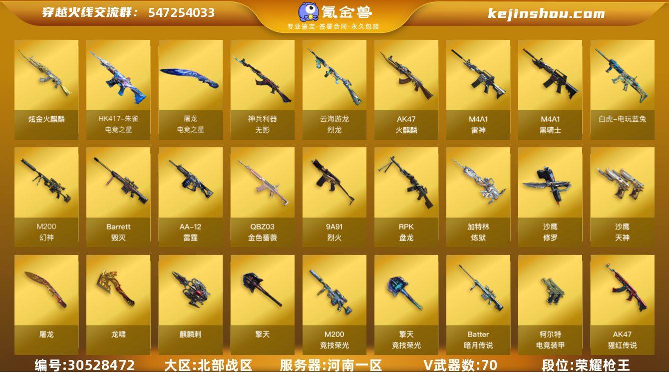 段位:荣耀枪王 VIP等级:2 V武器数:70 王者武器数:0 炫金武器数:1 炫金火麒麟 HK417-朱雀-电竞之星,屠龙-电竞之星,无影-神兵利器,烈龙-云海游龙,AK47-火麒麟,M4A1-雷神,M4A1-黑骑士,白虎-电玩蓝兔,M200-幻神,Barrett-毁灭,AA-12-雷霆,QBZ03-金色蔷薇,9A91-烈火,RPK-盘龙,加特林-炼狱,沙鹰-修罗,沙鹰-天神,屠龙,龙啸,麒麟刺,擎天,M200-竞技荣光,擎天-竞技荣光,Barrett-暗月传说,柯尔特-电竞装甲,AK-47-猩红传说,烈龙,柯尔特-冠军之特,龙啸-烈火龙威,烈火-动感闪耀,屠龙-动感闪耀,擎天-云海游龙,Barrett-碧霄极光 王者玲珑 魅影,瞳,战地猎狐 HK417-朱雀-电竞之星-竞星跃动音效卡,屠龙-电竞之星-竞星跃动音效卡,金色蔷薇音效卡,M200-幻神音效卡,M4A1-黑骑士音效卡,Barrett-毁灭音效卡,M4A1-雷神音效卡,AK47-火麒麟音效卡 卖家说:河南一区-爆破生化双修-幻神2皮带俩音效卡-雷神、火麒麟、qbz冠军皮肤-冠军柯尔特带小刀-qbz蔷薇俩音效卡、雷神、火麒麟、毁灭、黑骑士都带皮带音效卡-m200竞技荣光-白虎—蝴蝶+6烈+6盘生化装。总共70v!可小刀