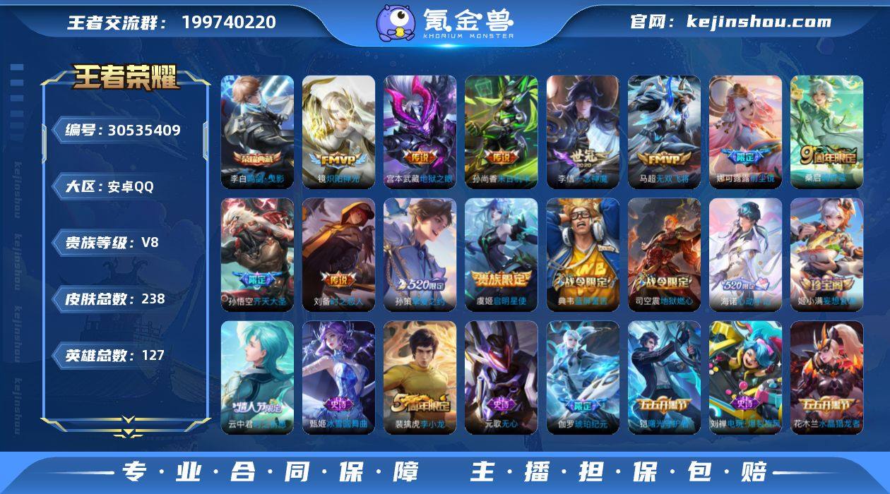 贵族8/皮肤238/典藏1/传说11/史诗58/英雄127/金标芈月/海诺全皮/鸣剑·曳影/鸣野蒿/齐天大圣/前尘镜/无双飞将/挚爱之约/炽阳神光/启明星使/一念神魔/时之恋人-刘备/末日机甲-孙尚香/地狱之眼/阴阳师/皇家上将/白昼王子/高山流水/玩趣恶龙/奇幻香踪/无心/蓝屏警告/魔术师/万华元夜(s22)/沙漠行僧(s26)/海滩派对/醍醐杖(s20)/演武夺筹(s23)/金庭之子(s27)/云中旅人(s29)/驱傩正仪(s24)/潮玩骑兵/黎明之约/繁星吟游/原初探秘者(s21)/千军破阵(s25)/原初追遂者/大漠名商(s28)/李小龙/擒涛扼浪(s31)/纤云弄巧/时之祈愿-云中君/梁祝/拒霜思/暖冬·兔眠/玲珑珍味/狂想玩偶喵/探海日志(s32)/海盐诗旅(s30)/星界游侠/驭风魔法/女武神/流音漫舞/地狱燃心/江河有灵/古海寻踪(s33)/百解令(蒙犽)/高渐离燃音魔法/妲己灵卜魔法/鬼谷子天穹祈灯(S34)/琥珀纪元伽罗/妄想食味/超元猎域/龙武盛年/蔬乡物语(鲁班七号)/蔬乡物语(李元芳)/剑破天穹(s35)/程咬金群星魔术团/青焰无极/苍威无极/海诺心动手记/熔金海岸/未来纪元-赵云/圣诞恋歌/冰雪圆舞曲/偶像歌手/地狱岩魂/鬼剑武藏/水果甜心/暗夜贵公子/魅力维加斯/金属风暴/圣诞狂欢/绅士熊喵/幽灵船长/水晶猎龙者/乘风破浪/缤纷独角兽/黄金分割率/冰冠公主/特工魅影/曙光守护者/舞动绿茵/天才门将/逐浪之夏/功夫厨神/星夜王子/猫狗日记-孙策/鹰眼统帅/天秀·启明/电玩·爆裂旋风/浮梦罗烟/教廷特使/街头霸王/哥特玫瑰/爱心护理/大发明家/忍·炎影/红桃皇后/白色死神/西部大镖客(牛魔)/东方不败/化身博士/救世之瞳/未来纪元-宫本武藏/玩偶对对碰/时尚教父/少女阿狸/黄金武士/死亡骑士/拳王/兔女郎/五福同心/花好人间/万象初新/纽约教父/龙腾万里/海滩丽影/幻想奇妙夜/功夫老勺/沉稳之力/掌控之力/敏锐之力/幻乐之宴/坚韧之力/守护之力/虹云星官/幽兰居士/野性能量/归虚梦演-蒙犽/鲨炮海盗猫/...