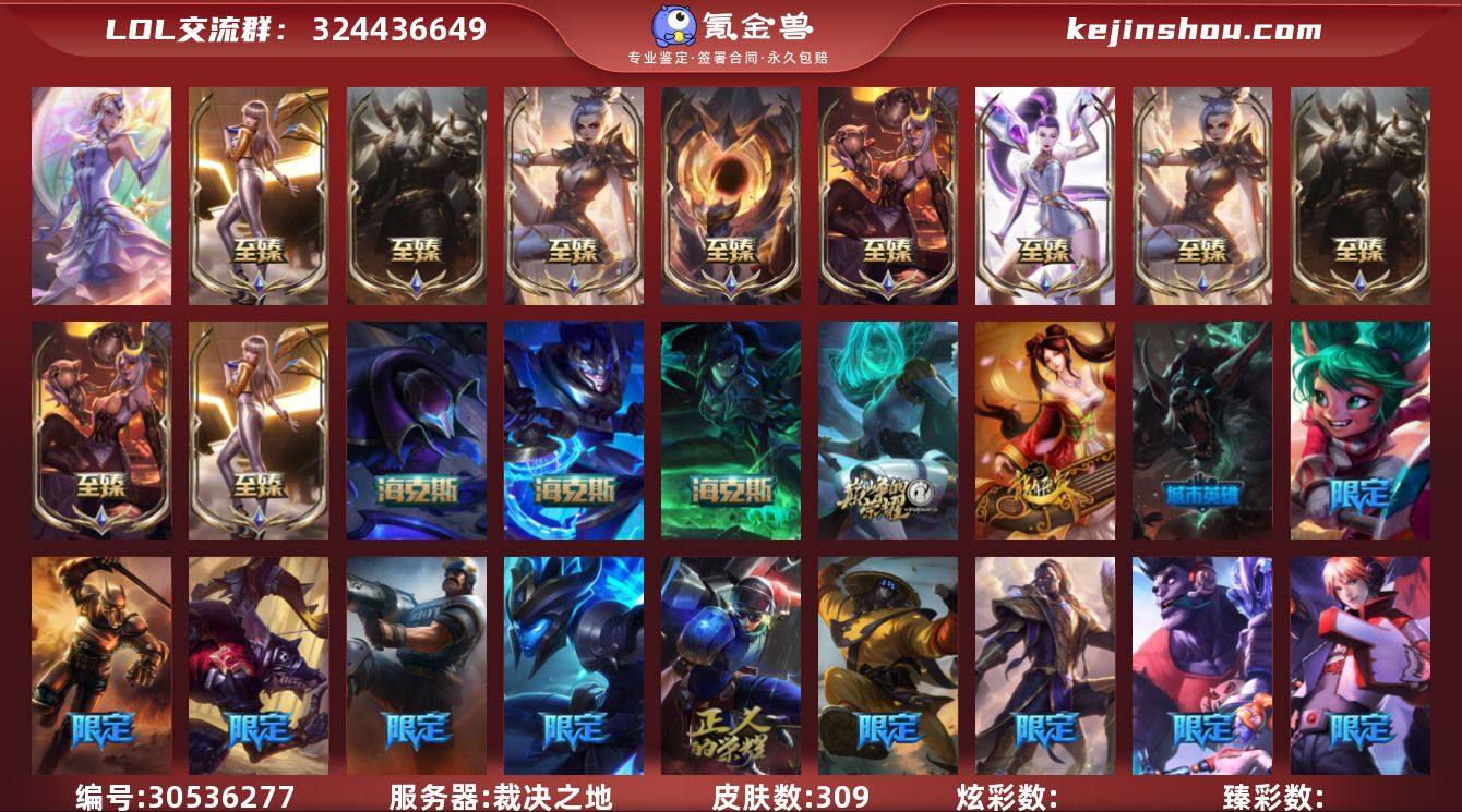 【店主推荐捡漏号】未定级段位-171英雄-227皮肤-73炫彩-0终极-4神话-28限定-22传说-48史诗 【神话皮肤】:十周年纪念安妮,十五周年纪念希维尔,神凰行者瑞羽圣凰艾尼维亚,海克斯科技斯维因 【臻彩皮肤】:无畏骑士瑟庄妮赤子初心,赵云子龙炫金将军,闭月之颜貂蝉炫金莲华,咖啡甜心金克丝核桃巴菲,霸天异形卡兹克刹那银光,可爱可爱粉红红布里茨,魔女阿卡丽虚荣,净雪之月莫甘娜冬虹,红莲之刃锐雯 【海克斯皮肤】:海克斯科技斯维因 【冰雪限定】:阿木木“主人不要我了”,胡桃夹子萨科,平安夜女神娑娜,喜庆之树茂凯,圣诞玩偶波比,魄罗骑士瑟庄妮,冰雪兽纳尔 【限定皮肤】:Fnatic迦娜,SKTT1贾克斯,电玩女神阿狸,暗裔英雄盖伦,胜利女神奥莉安娜,胜利机器人布里茨,胜利女神瑟庄妮,胜利凤凰艾尼维亚,胜利之王泰达米尔,胜利巨口克格莫,胜利女神娑娜,胜利剑圣易,胜利女神菲奥娜,无头骑士赫卡里姆,糖果使徒费德提克,泳池派对菲奥娜,暗影沃里克,野兽猎人德莱文,都铎王朝图奇,防暴天使凯尔,双城之战2教授黑默丁格 【传说皮肤】:地狱之门卫士加里奥,大天使长米迦勒凯尔,钢铁之翼凯尔,烈焰雄心崔丝塔娜,合金巨兽努努和威朗普,女皇艾希,恶魔之刃泰达米尔,黯晶凤凰艾尼维亚,冰霜之刃艾瑞莉娅,最终BOSS维迦,地狱行者孙悟空,神拳李青,银河魔装机神兰博,炼狱魔犬内瑟斯,屠龙勇士潘森,日蚀骑士蕾欧娜,符文战熊沃利贝尔,宇航员诺提勒斯,女校长菲奥娜,霸天异形卡兹克,灌篮高手德莱厄斯,奥德赛凯隐 【史诗皮肤】:安伯斯与提妮,皇家火枪手崔斯特,特战先锋赵信,圣光审判凯尔,侍魂易,钢铁之心希维尔,圣洁化身索拉卡,兔宝宝提莫,熊猫提莫,紫晶射手艾希,少林武僧贾克斯,刀锋女王莫甘娜,熔火之心拉莫斯,掠星魔刃卡萨丁,夜行义贼艾瑞莉娅,恐惧新星普朗克,穿着正装的...