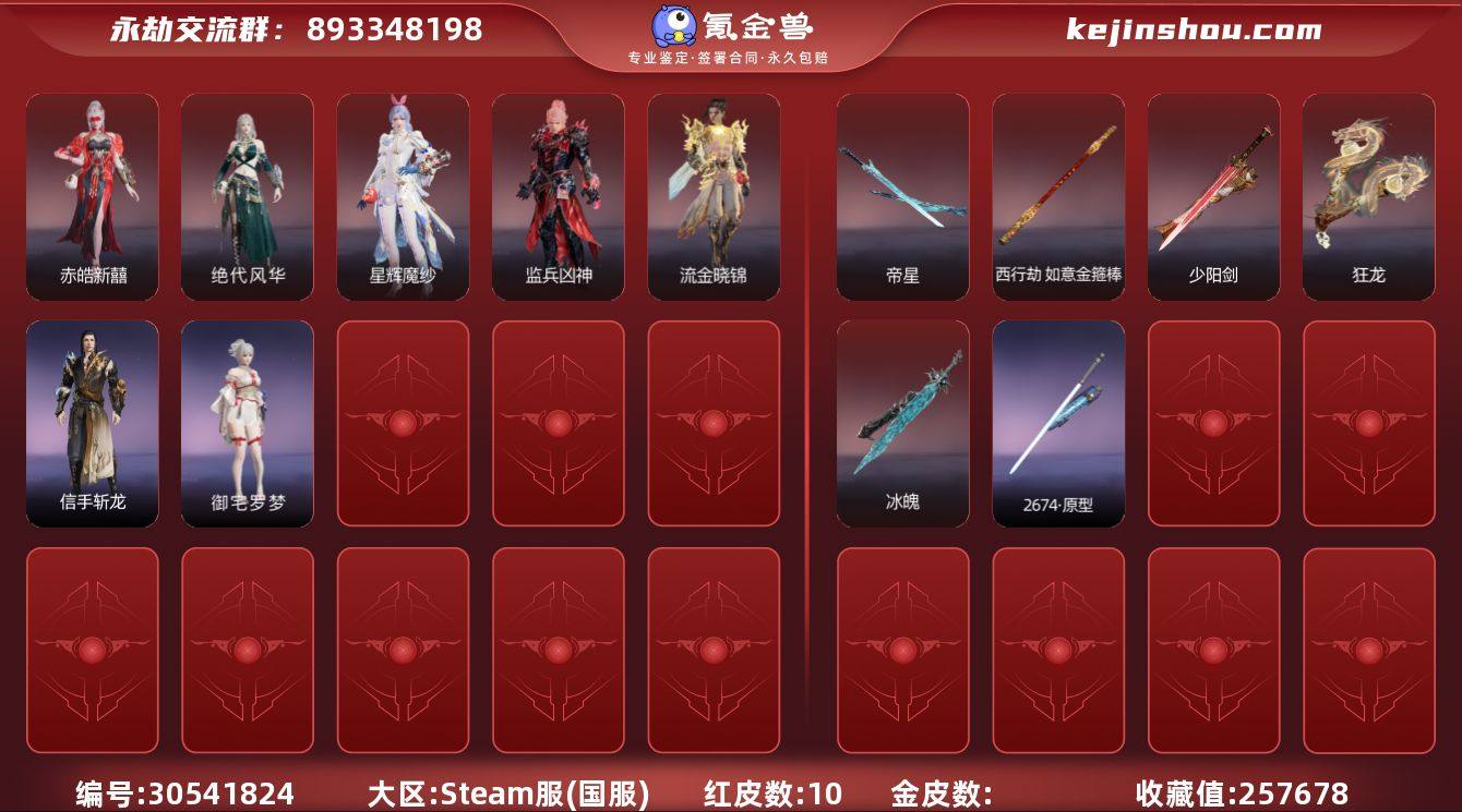 YJJ1275/steam/可换绑/等级274/s19三人白银1/16红317金收藏值257678/赤皓新囍/星辉魔纱/化生明王//蝶梦/暮光胴丸//沙漠香风/绝代风华/监兵凶神/流金晓锦/少阳剑/冰魄/帝星/龙雀//狼主/西行劫·如意金箍棒/狂龙/2674·原型/璃光·星辉环月/信手斩龙/洛天依·星轨引航/御宅罗梦(白丝)/龙之影·过江龙//千秋匠心·凶虎/封神录·赤莲/幻丝41290/已绑定手游