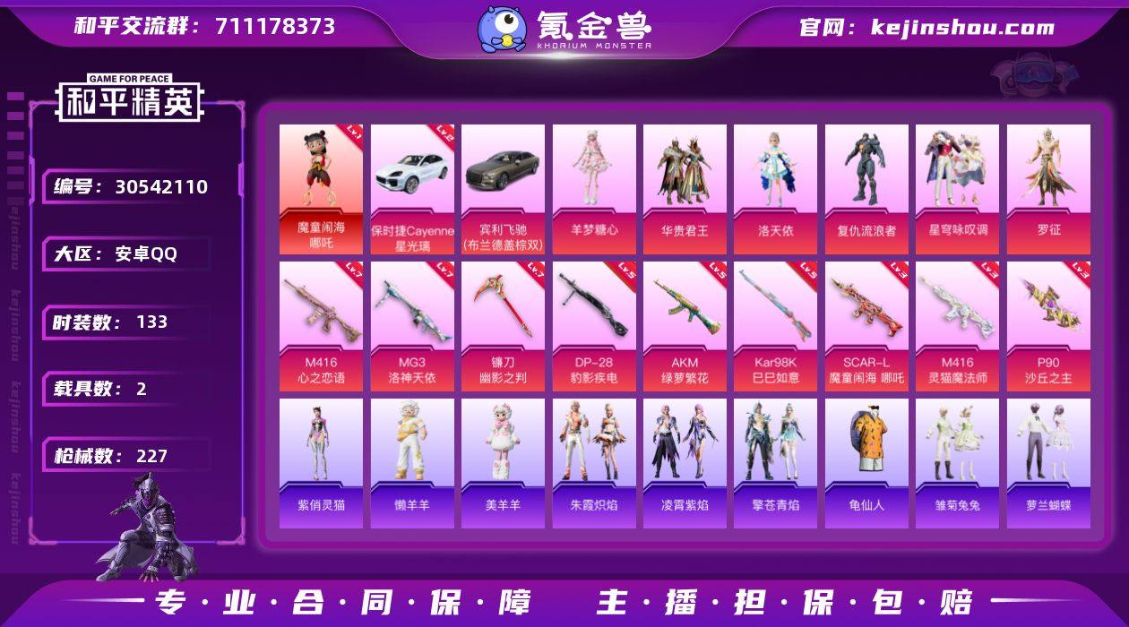 YZJ13438-可二次 安卓Q-【极品红装素材号 地铁天赋满级 保时捷升级车星光璃 M4灵猫 新红装艾丽娅 魔丸哪吒 洛天依 羊梦 咏叹调 罗征[异色野人] 美羊羊 都市丽猫 贝斯之夜】2红装2载具6粉装9特效枪4热门133套装227枪皮 81475热力值 9印记 历史卓越王牌7星 【2红装】 暮色玫影-艾丽娅 (2级) 魔童闹海-哪吒 (1级) 【2载具】 保时捷Cayenne(星光璃) (2级) 宾利飞驰布罗德盖棕双色 【6粉装】 洛天依 罗征 星穹咏叹调 羊梦糖心 华贵君王 复仇流浪者 【9特效枪】 M416-心之恋语 (7级) SCAR-L-魔童闹海哪吒 (3级) M416-灵猫魔法师 (3级) P90-沙丘之主 (3级) AKM-绿萝繁花 (5级) Kar98K-巳巳如意 (5级) DP-28-豹影疾电 (5级) MG3-洛神天依 (7级) 镰刀-幽影之判 (7级) 【4热门】 龟仙人 怪笑疯兔 诡面顽熊 豚鼠丹丹 【1头盔】 梦幻火箭头盔 营地ID:929027475