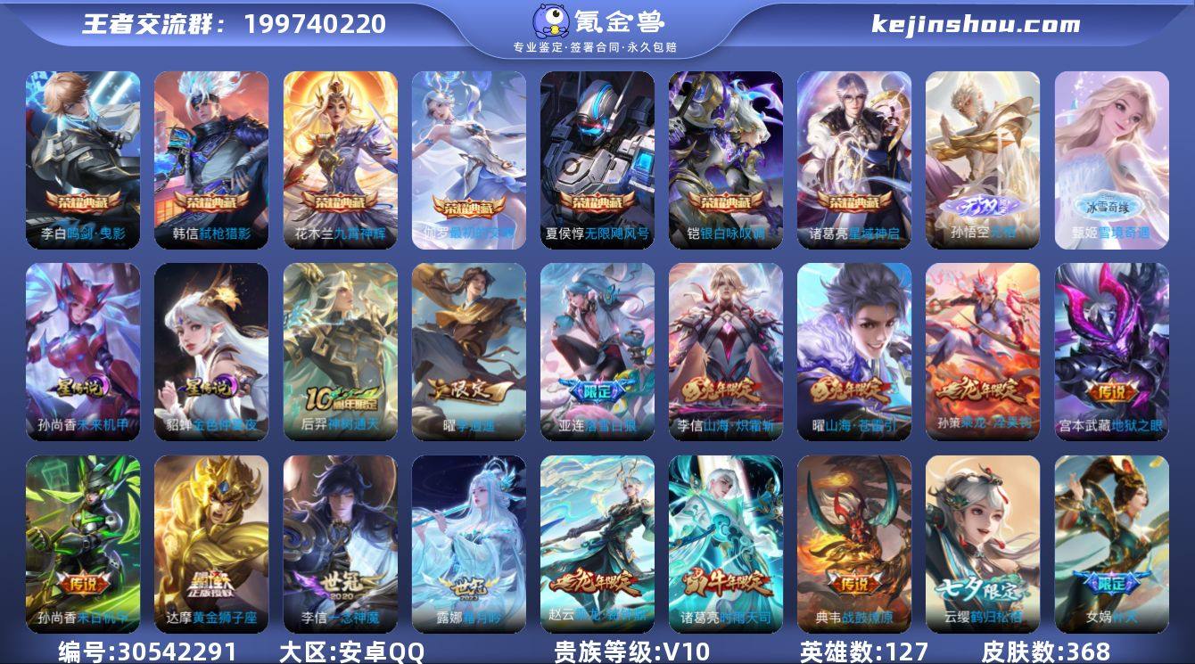 贵族等级:V10 典藏皮肤数:7 珍品无双皮肤数:0 无双皮肤数:2 珍品传说皮肤数:0 传说皮肤数:58 史诗皮肤数:103 皮肤数:368 英雄数:127 段位:星耀 卖家说:和平精英5载具两把粉枪