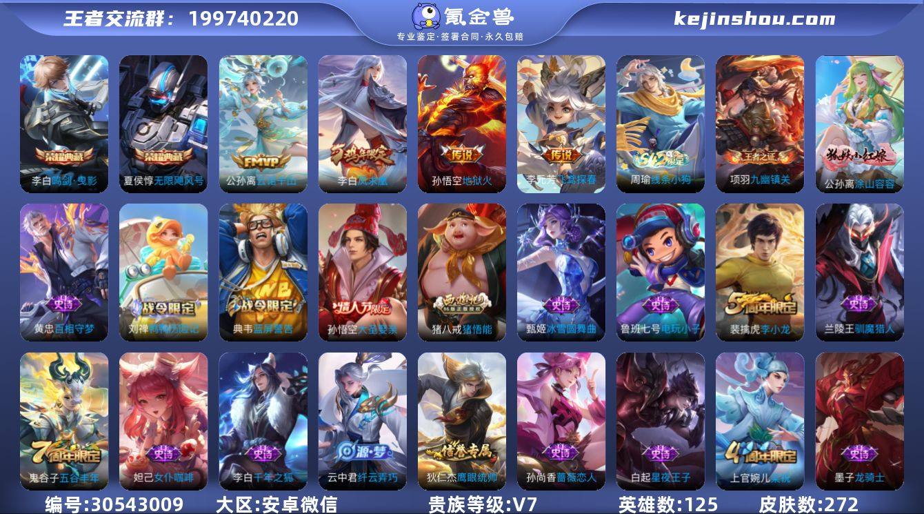 典藏2 星元3 传说3 史诗48 限定77 荣耀水晶3 英雄125 皮肤260 稀有英雄8 【小国标1】 国服李白 【荣耀典藏2】 李白鸣剑曳影 夏侯惇无限飓风号 【星元皮肤3】 孙悟空幽冥火 李白梧桐落 李白暮雪归 【传说皮肤3】 公孙离云诺千山 孙悟空地狱火 李白凤求凰