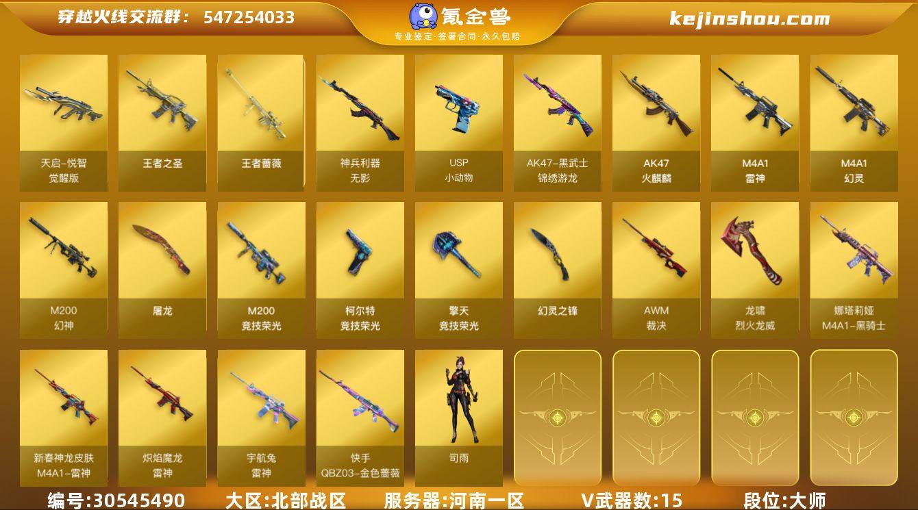 段位:大师 VIP等级:VIP6 V武器数:15 王者武器数:3 天启-悦智-觉醒版,王者之圣,王者蔷薇 无影-神兵利器,USP-小动物,AK47-黑武士-锦绣游龙,AK47-火麒麟,M4A1-雷神,M4A1-幻灵,M200-幻神,屠龙,M200-竞技荣光,柯尔特-竞技荣光,擎天-竞技荣光,幻灵之锋,裁决,龙啸-烈火龙威 司雨 卖家说:自用爆破号,连体LOL,王者荣耀,金铲铲,市面上的游戏都玩