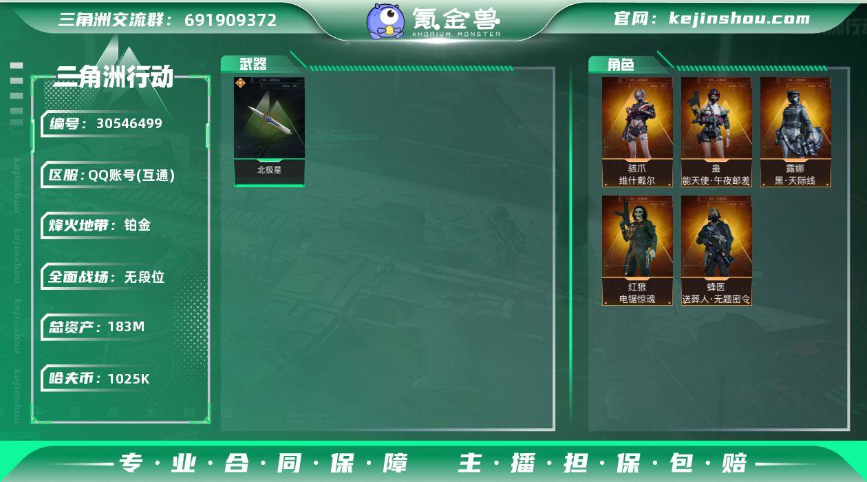 总资产:183M 哈夫币:1025K 烽火地带等级:60 烽火地带段位:铂金 全面战场段位:无段位 骇爪-维什戴尔,蛊-能天使·午夜邮差,露娜-黑·天际线 红狼-电锯惊魂,蜂医-送葬人·无题密令 北极星 卖家说:小麦水墨云图垫了六抽 还有很多限定红
