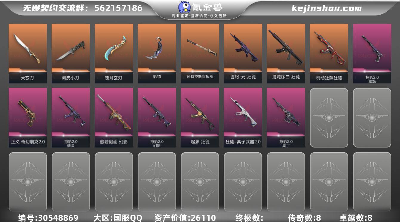 说: 无畏契约成品号2.6w资产 刀皮都是手感不错的 抢皮也不错 上个赛季超凡 还没定级 一共6个超凡挂件 可小刀