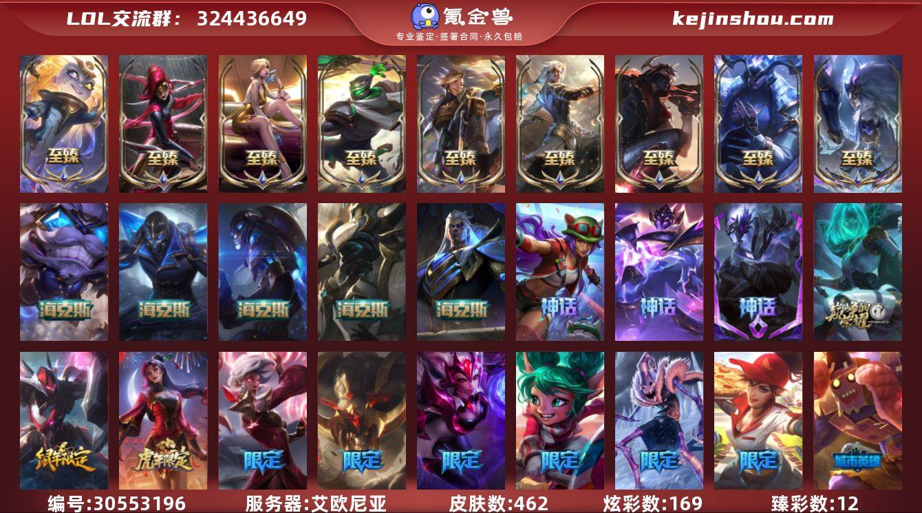 t33738【艾欧尼亚】462皮肤 169炫彩 12臻彩 22神话/71限定/39传说/172英雄 账号等级:509 云顶神话:2 【重要头像】我麦是开的么 【重要皮肤】永恒星灵佐伊至臻 暗裔英雄嘉文四世至臻 黑色玫瑰假面舞会卡特琳娜至臻 青花瓷千珏至臻 DRX亚托克斯至臻 西部魔影猎天使恶魔泰隆至臻 灵能特工伊泽瑞尔至臻 黑夜使者凯隐至臻 征服者贾克斯至臻 KDA伊芙琳至臻 水晶巫灵泽拉斯 灰烬杀手塞拉斯 海克斯科技斯维因 海克斯科技吉格斯 海克斯科技玛尔扎哈 真实伤害突破界限艾克 零之枪骑赫卡里姆 胜利剑圣易 胜利女神娑娜 胜利之王泰达米尔 胜利巨口克格莫 天龙之子卡莎 烈焰仙子黛安娜 胜利女神奥莉安娜 胜利枪神格雷福斯 胜利枪神卢锡安 胜利之剑亚托克斯 觅心魔灵奥莉安娜 觅心女王艾希 冬季仙境奥莉安娜 圣诞老人布隆 冰雪驯鹿波比 冰封王子蒙多 冰雪女神辛德拉 魄罗骑士瑟庄妮 平安夜女神娑娜 魅惑女巫崔丝塔娜 南瓜头王子阿木木 泳池派对雷克顿 送披萨的小姐姐希维尔 EDG格雷福斯 iG菲奥娜 SKTT1辛德拉 SKTT1娜美 SKTT1奥拉夫 SKTT1瑞兹 SKTT1阿兹尔 SSW泰隆 SSW图奇 SSW辛吉德 暗杀星奥莉安娜 暗杀星蒙多 Fnatic迦娜 冰雪节格雷福斯 冰雪节辛吉德 防暴士兵辛吉德 防暴天使凯尔 钢铁之翼艾尼维亚 冠军典狱长锤石 冠军之矛卡莉丝塔 冠军之隐劫 冠军之志瑞兹 鬼影森森茂凯 海贼瑞兹 红桃杰克崔斯特 惊悚派对阿木木 惊悚派对费德提克 蓝色忧郁崔斯特 蒙多蒙多 圣诞狂欢基兰 圣诞老人古拉加斯 圣诞玩偶波比 圣诞驯鹿克格莫 糖果使徒费德提克 喜庆之树茂凯 邪恶圣诞老人维迦 幸福女神乐芙兰 雪默丁格 勇者阿狸 征服者阿利斯塔 征服者卡尔玛 阿木木主人不要我了 波比的巧克力工坊 都铎王朝图奇 十五周年纪念希维尔 十周年纪念安妮 源代...
