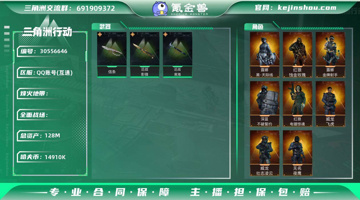 JHS2662-总资产128.1m-1491w哈夫币【仓库8,体力7,耐力6】S7(2x3)六格【影锋,信条,黑海】【蚀金玫瑰,飞虎,壮志凌云,夜鹰,送葬人,深蓝-不破誓约,红狼-电锯惊魂,露娜-金牌射手,天际线】【六甲8个 头盔6个 aw71发 咖啡豆18个棱镜攻势S2(优品B)】