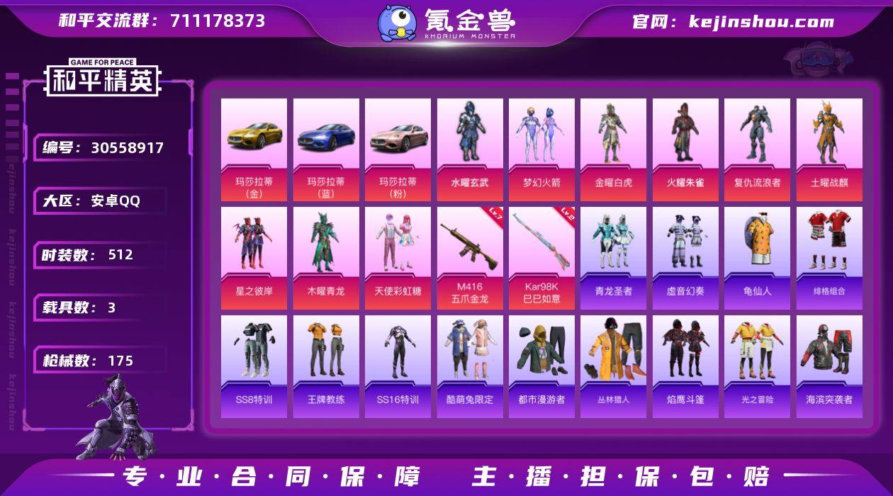 热力值:58382 载具数:3 时装数:512 枪械数:175 战备数:121 游戏等级:66 卓越印记:1 传奇印记:0 绝世印记:0 复仇流浪者,火曜朱雀,金曜白虎,梦幻火箭,木曜青龙,天使彩虹糖,水曜玄武,土曜战麒,星之彼岸 七级M416-五爪金龙,二级Kar98K-巳巳如意 玛莎拉蒂Ghibli(金),玛莎拉蒂Ghibli(粉),玛莎拉蒂Ghibli(蓝) 至尊龙雀飞行服,暗夜鎏金降落伞,春暖花开降落伞,古堡领主降落伞,精灵迷巫降落伞,深海曼妙降落伞,四圣焕新降落伞,炙焰牛王降落伞,至尊龙雀降落伞 暗夜行者,冰川特警,北国孤狼,滨海假日,白色伏地魔,春光漫游,雏菊兔兔,长空猛禽,丛林猎人,传奇侦探,炽焰拳师,纯真浪花,都市漫游者,菲菲,绯格组合,粉红小猪,伏击者,疯狂小兔子,福星高照,飞行日记,格斗先锋,格斗专家,龟仙人,光之冒险,海滨突袭者,幻彩翩翩,虎虎生威吉莉,湖蓝色名流,黑色刀锋,黑色伏地魔,灰色格斗者,海上生明月,红色运动,幻世战舞者,和煦暖阳,幻羽潜行,绝对偶像,惊鸿侠骨,橘黑制服,娇憨猪猪,竞技名士,竞技勇士朋克,坚韧舞者,精神漫游,金鼠迎春,街舞之王,机械哨兵,锦衣飞扬,空岛之星,酷萌兔限定,快闪甜心,空投萌叽,龙的传人,萝兰蝴蝶,黎明保卫者,猎梦纪元,罗小黑,妙红点点,萌黄之夏,懵萌河马,萌趣咩咩,迷域探索者,霓虹街区,柠萌假日,牛气冲天,牛气满满,轻风白浪,拳皇97草薙京,青龙圣者,青年教官,青涩时光,青团波波,骑行爱好者,清新柠檬,青玉碎影,软萌银虎,热情海星,圣诞大吉,深蓝冒险家,神气柴柴,SS10特训,SS11特训,SS12特训,SS13特训,SS14特训,SS16特训,SS17特训,SS18特训,SS20特训,SS21特训,SS22特训,SS23特训,SS24特训,SS25特训,SS26特训,SS27特训,SS30特训套装,SS31特训套装,SS5特训,SS6特训,SS7特训,SS8特训,SS9特训,巳巳如意,水银刺客,探宝勇士,甜蜜告白,涂山之恋,糖糖葫芦,甜心亚梦,田园牧歌,王牌教练,星河浪客,绚烂繁星,夏日音浪,雪山精英,核芯基因,虚音幻奏,跃动心情,玉兔迎春,云纹魔法士,焰鹰斗篷,耀眼新星,战地菁英,智慧之神 AA12-G-纯真浪花,AC-VAL-快闪甜心,AC-VAL-天降萌叽,AC-VAL-甜心亚梦,AKM-彩虹符号,AKM-虎虎生威,AKM-龙的传人,AKM-霓虹街区,AKM-破晓战魂,AKM-玉龙,AMR-暗夜行者,AMR-妙红点点,AWM-纯真浪花,AWM-焰鹰斗篷,爆炸猎弓-惊鸿侠骨,DBS-甜心亚梦,DBS-焰鹰斗篷,DP-28-甜心亚梦,DP-28-焰鹰斗篷,G36C-金风玉露,G36C-镜域双华,G36C-懵萌河马,GROZA-黑色刀锋,GROZA-懵萌河马,GROZA-生命誓言,GROZA-田园牧歌,GROZA-影袭,Kar98K-彩虹符号,Kar98K-红色方程式,Kar98K-王子的夏天,Kar98K-勇闯险境,M16A4-冰河战士,M16A4-幻世战舞者,M16A4-快乐主宰,M16A4-魔法学院,M16A4-甜心亚梦,M200-惊鸿侠骨,M200-乌木金纹,M249-彩虹符号,M249-妙红点点,M249-破晓战魂,M249-拳皇97,M416-糯团青竹,M417-惊鸿侠骨,M762-雏菊兔兔,M762-牛气冲天,M762-拳皇97,M762-天降萌叽,MG3-幻世战舞者,MG3-惊鸿侠骨,MG3-妙红点点,蜜獾-天降萌叽,蜜獾-娇憨猪猪,蜜獾-糖糖葫芦,Mini14-雏菊兔