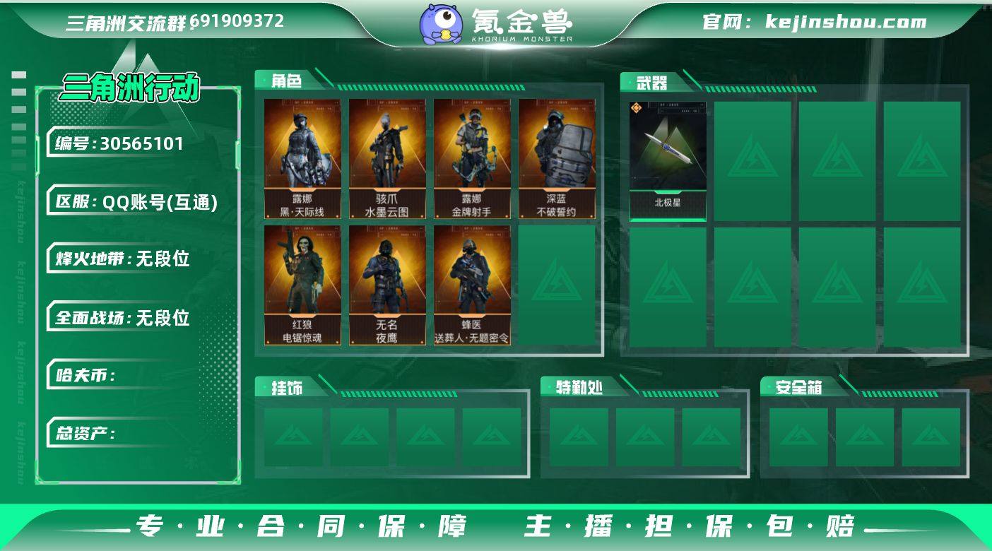 实名: 可修改 烽火地带段位: 无段位 全面战场段位: 无段位 传说武器皮肤: 近战-北极星 干员外观: 骇爪-水墨云图,无名-夜鹰(S4),蜂医-送葬人·无题密令(S5),露娜-黑·天际线,深蓝-不破誓约(S6),红狼-电锯惊魂,露娜-金牌射手(S7) 【乐乐Z84】【资产293M】【现金3853K】【北极星】【特勤8576】【干员皮电锯惊魂】【夜鹰】【送葬人】【不破誓约】【黑天际线】【金牌射手】【水墨云图】【aw子弹168发】
