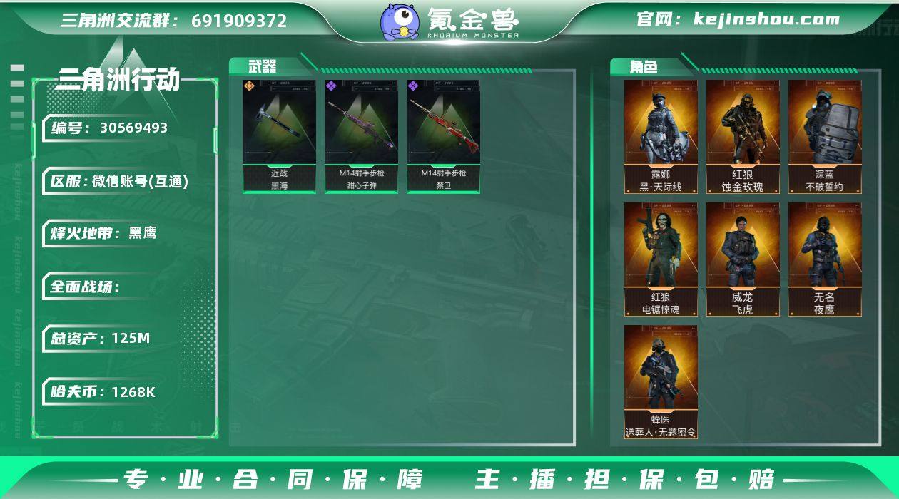 总资产:125M 哈夫币:1268K 烽火地带等级:60 烽火地带段位:黑鹰 全面战场等级:50 露娜-黑·天际线,红狼-蚀金玫瑰 深蓝-不破誓约,红狼-电锯惊魂,威龙-飞虎,无名-夜鹰,蜂医-送葬人·无题密令 黑海