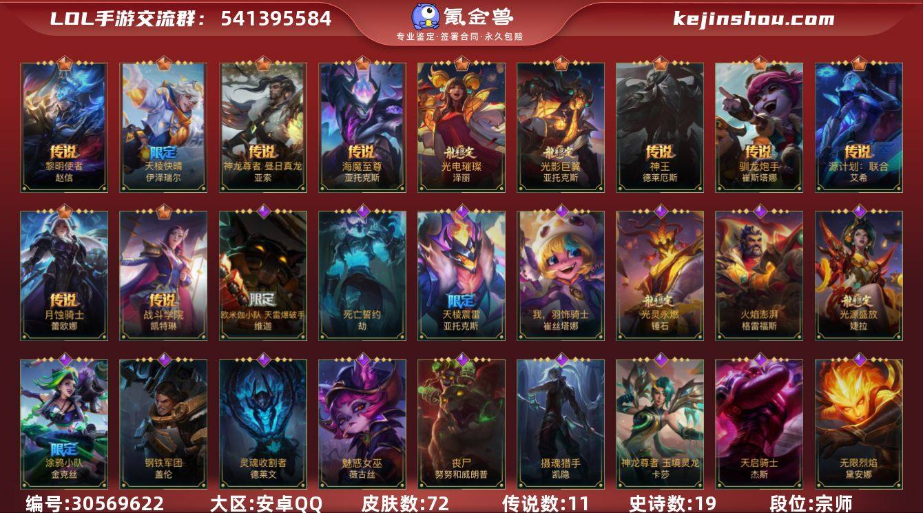 皮肤数:72 典藏皮肤数量:0 神话皮肤数量:0 传说皮肤数量:11 史诗皮肤数量:19 段位:宗师